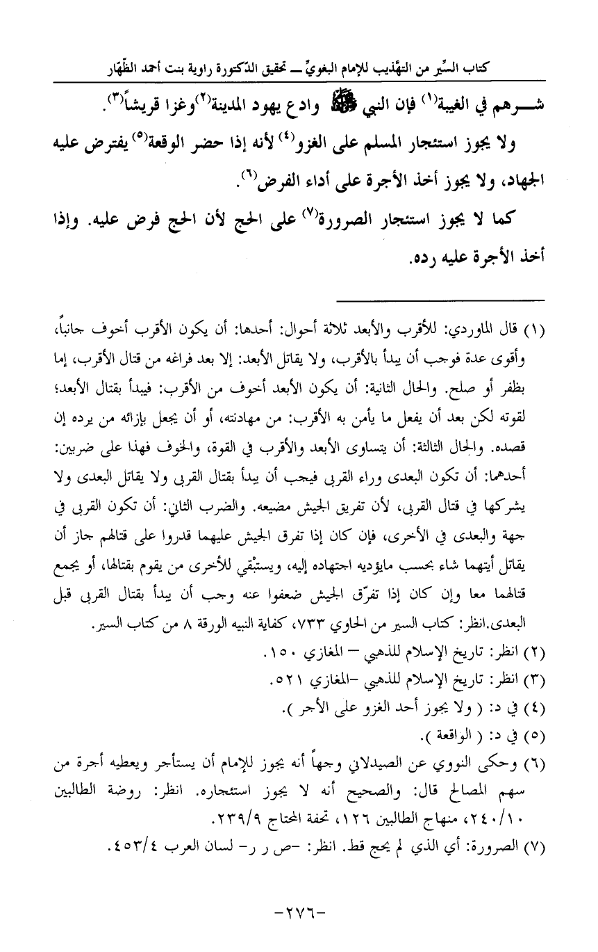 1 - قَالَ الْمَاوَرْدِيّ: "للأقرب والأبعد ثَلَاثَة أَحْوَال: أَحدهَا: أَن يكون الْأَقْرَب أخوف جانباً، وَأقوى عدَّة فَوَجَبَ أَن يبْدَأ بالأقرب، وَلَا يُقَاتل الْأَبْعَد: إِلَّا بعد فَرَاغه من قتال الْأَقْرَب، إِمَّا بظفر أَو صلح. وَالْحَال الثَّانِيَة: أَن يكون الْأَبْعَد أخوف من الْأَقْرَب: فَيبْدَأ بِقِتَال الْأَبْعَد؛ لقُوته لَكِن بعد أَن يفعل مَا يَأْمَن بِهِ الْأَقْرَب: من مهادنته، أَو أَن يَجْعَل بإزائه من يردهُ إِن قَصده. وَالْحَال الثَّالِثَة: أَن يتساوى الْأَبْعَد وَالْأَقْرَب فِي الْقُوَّة، وَالْخَوْف فَهَذَا على ضَرْبَيْنِ: أَحدهمَا: أَن تكون البعدى وَرَاء الْقُرْبَى فَيجب أَن يبْدَأ بِقِتَال الْقُرْبَى وَلَا يُقَاتل البعدى وَلَا يشركها فِي قتال الْقُرْبَى، لِأَن تَفْرِيق الْجَيْش مضيعه. وَالضَّرْب الثَّانِي: أَن تكون الْقُرْبَى فِي جِهَة والبعدى فِي الْأُخْرَى، فَإِن كَانَ إِذا تفرق الْجَيْش عَلَيْهِمَا قدرُوا على قِتَالهمْ جَازَ أَن يُقَاتل أَيَّتهمَا شَاءَ بِحَسب مَا يُؤَدِّيه اجْتِهَاده إِلَيْهِ، ويستبْقي لِلْأُخْرَى من يقوم بقتالها، أَو يجمع قتالهما مَعًا وَإِن كَانَ إِذا تفرّق الْجَيْش ضعفوا عَنهُ وَجب أَن يبْدَأ بِقِتَال الْقُرْبَى قبل البعدى". انْظُر: كتاب السّير من الْحَاوِي 733، كِفَايَة النبيه الورقة 8 من كتاب السّير.