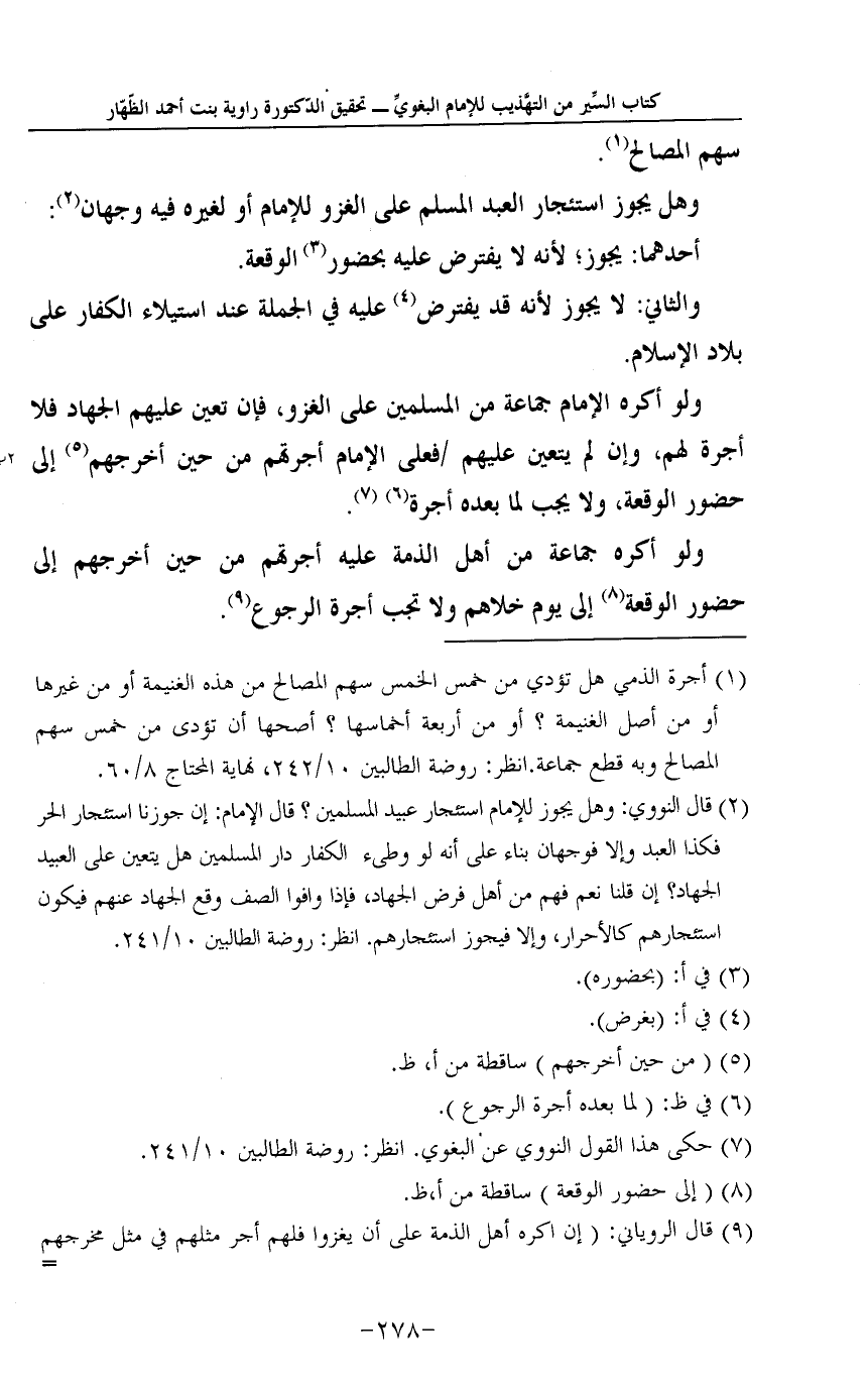 1 - أُجْرَة الذِّمِّيّ هَل تُؤدِّي من خمس الْخمس سهم الْمصَالح من هَذِه الْغَنِيمَة أَو من غَيرهَا أَو من أصل الْغَنِيمَة؟ أَو من أَرْبَعَة أخماسها؟ أَصَحهَا أَن تُؤَدّى من خمس سهم الْمصَالح وَبِه قطع جمَاعَة. انْظُر: رَوْضَة الطالبين 10/242، نِهَايَة الْمُحْتَاج 8/60.