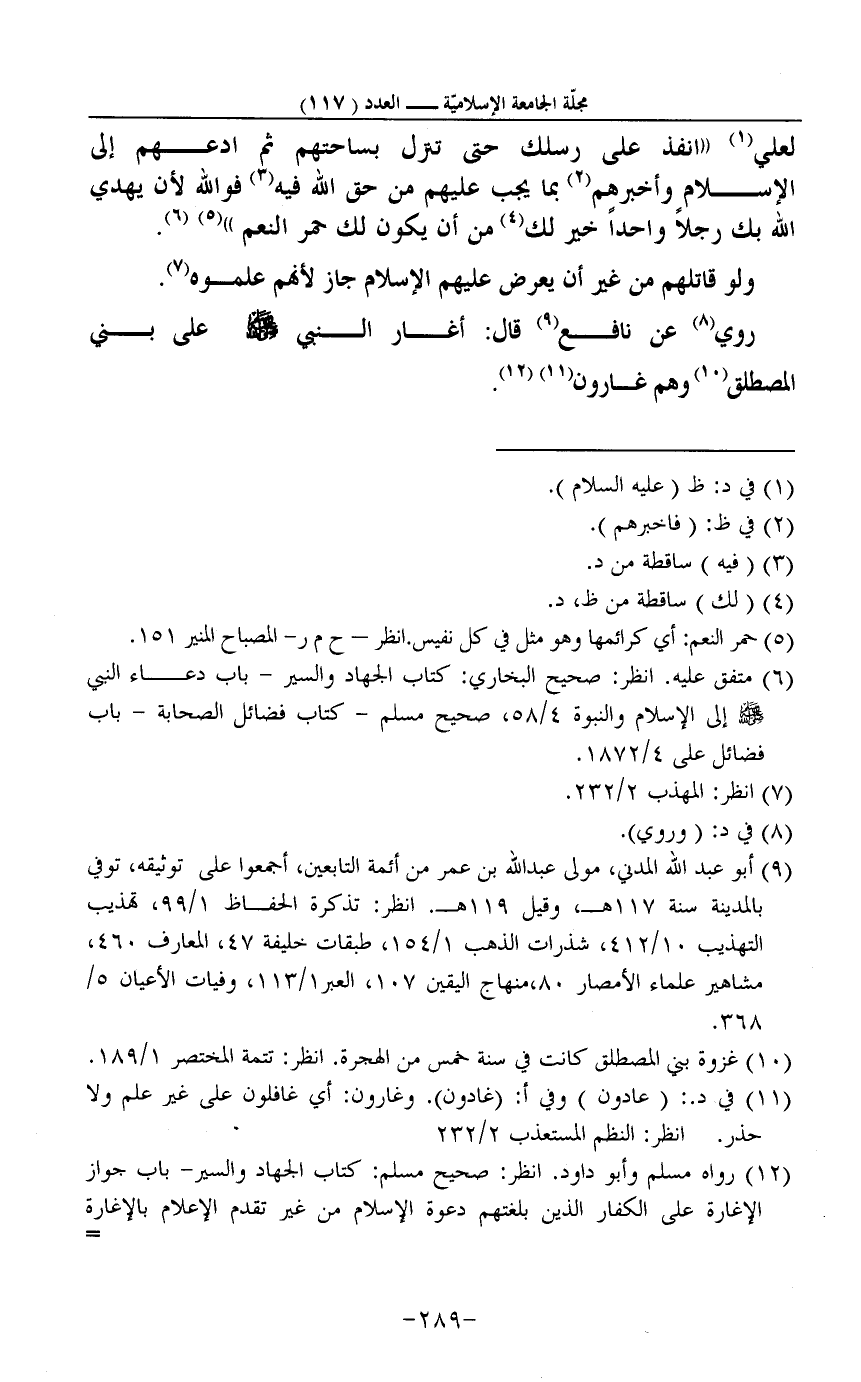 رُوِيَ 8 عَن نَافِع 9 قَالَ: أغار النَّبِي صلى الله عَلَيْهِ وَسلم على بني المصطلق10 وهم غَارونَ11 12.