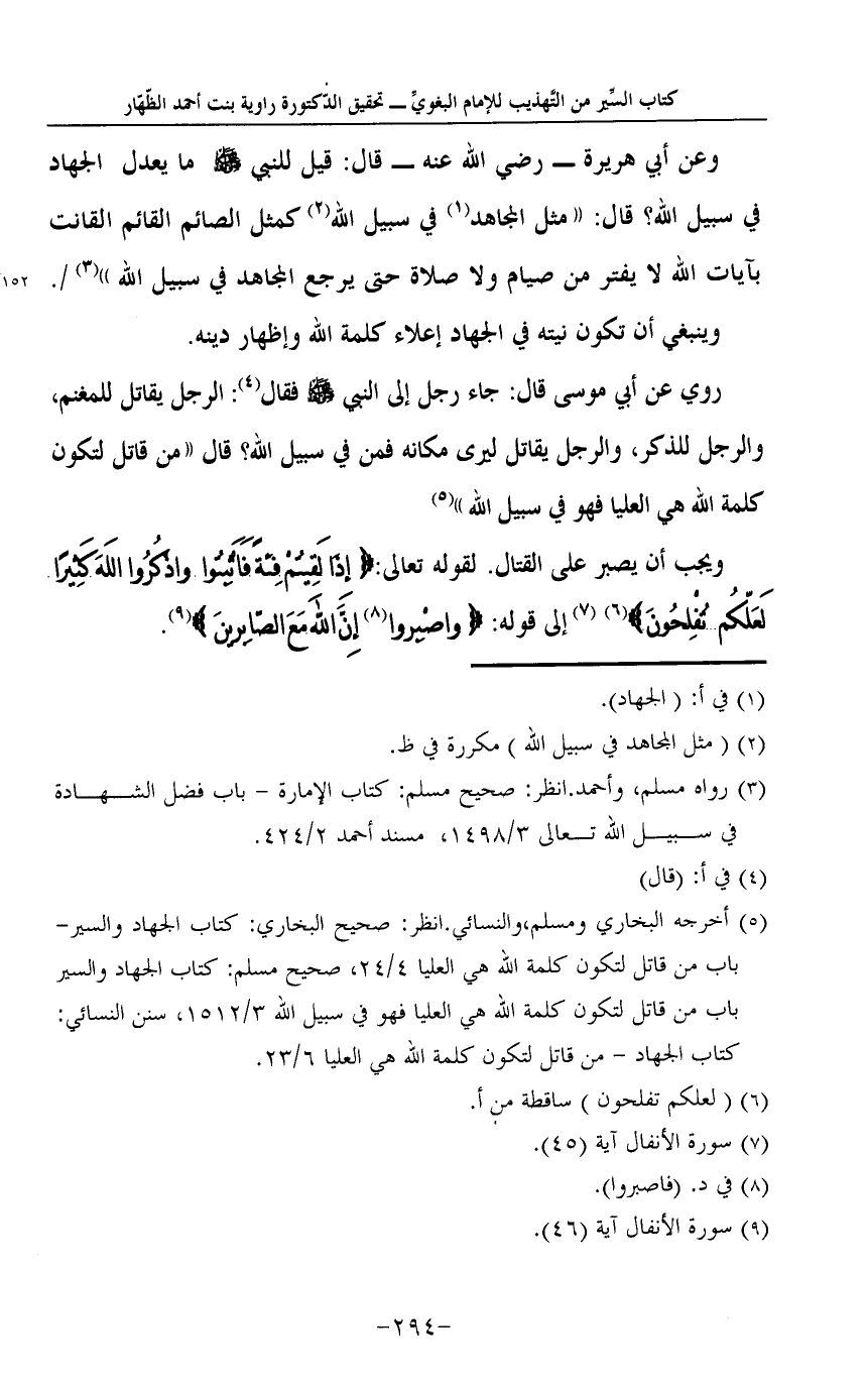5 - أخرجه البُخَارِيّ وَمُسلم، وَالنَّسَائِيّ. انْظُر: صَحِيح البُخَارِيّ: كتاب الْجِهَاد وَالسير - بَاب من قَاتل لتَكون كلمة الله هِيَ الْعليا 424، صَحِيح مُسلم: كتاب الْجِهَاد وَالسير بَاب من قَاتل لتَكون كلمة الله هِيَ الْعليا فَهُوَ فِي سَبِيل الله 31512، سنَن النَّسَائِيّ: كتاب الْجِهَاد - من قَاتل لتَكون كلمة الله هِيَ الْعليا 623.