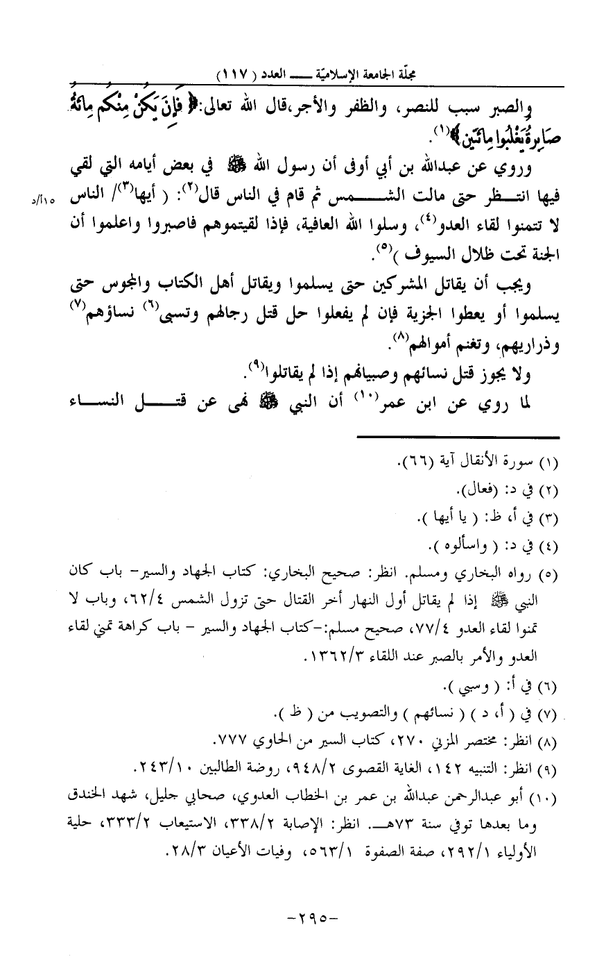 5 - رَوَاهُ البُخَارِيّ وَمُسلم. انْظُر: صَحِيح البُخَارِيّ: كتاب الْجِهَاد وَالسير - بَاب كَانَ النَّبِي صلى الله عَلَيْهِ وَسلم إِذا لم يُقَاتل أول النَّهَار أخر الْقِتَال حَتَّى تَزُول الشَّمْس 462، وَبَاب لَا تمنوا لِقَاء الْعَدو 477، صَحِيح مُسلم: - كتاب الْجِهَاد وَالسير - بَاب كَرَاهَة تمني لِقَاء الْعَدو وَالْأَمر بِالصبرِ عِنْد اللِّقَاء 31362.