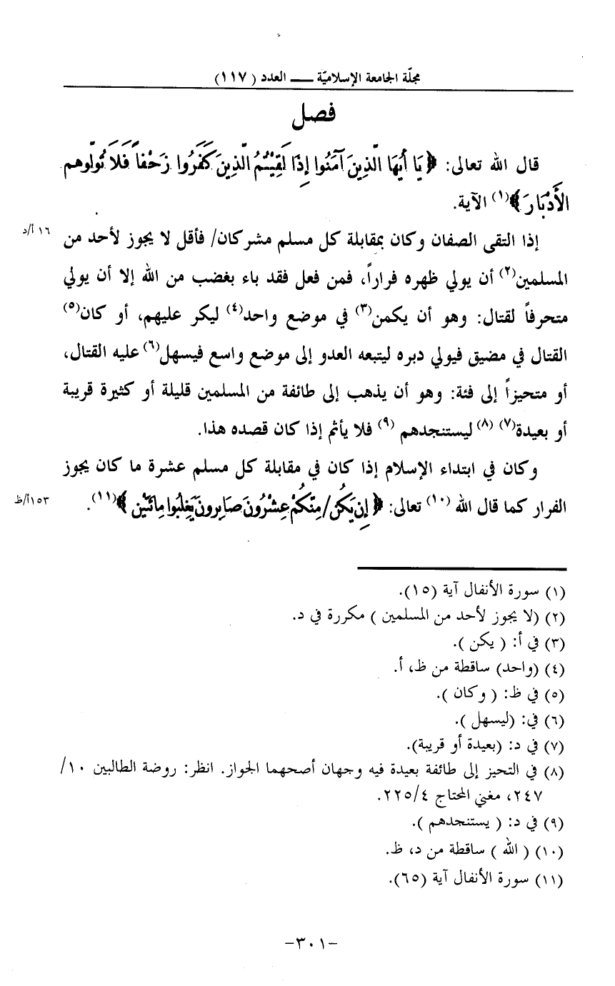 إِذا التقى الصفان وَكَانَ بِمُقَابلَة كل مُسلم مُشْرِكَانِ فَأَقل لَا يجوز لأحد من الْمُسلمين2 أَن يولي ظَهره فِرَارًا، فَمن فعل فقد بَاء بغضب من الله إِلَّا أَن يولي متحرفاً لقِتَال: وَهُوَ أَن يكمن3 فِي مَوضِع وَاحِد 4 ليكر عَلَيْهِم، أَو كَانَ 5 الْقِتَال فِي مضيق فيولي دبره ليتبعه الْعَدو إِلَى مَوضِع وَاسع فيسهل 6 عَلَيْهِ الْقِتَال، أَو متحيزاً إِلَى فِئَة: وَهُوَ أَن يذهب إِلَى طَائِفَة من الْمُسلمين قَليلَة أَو كَثِيرَة قريبَة أَو بعيدَة 7 8 ليستنجده9 فَلَا يَأْثَم إِذا كَانَ قَصده هَذَا.