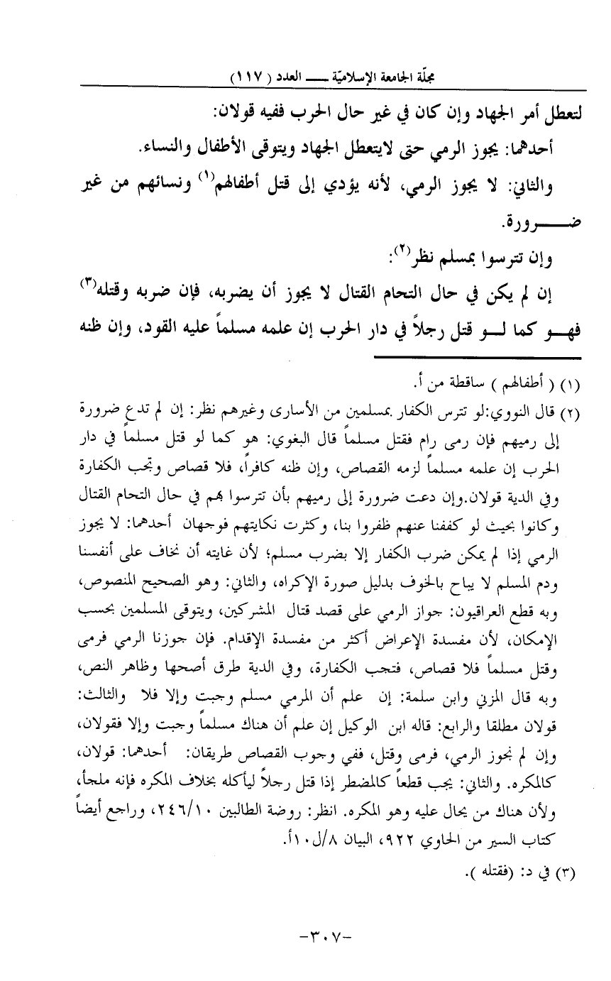 2 - قَالَ النَّوَوِيّ: "لَو تترس الْكفَّار بمسلمين من الْأُسَارَى وَغَيرهم نظر: إِن لم تدع ضَرُورَة إِلَى رميهم فَإِن رمى رام فَقتل مُسلما قَالَ الْبَغَوِيّ: هُوَ كَمَا لَو قتل مُسلما فِي دَار الْحَرْب إِن علمه مُسلما لزمَه الْقصاص، وَإِن ظَنّه كَافِرًا، فَلَا قصاص وَتجب الْكَفَّارَة وَفِي الدِّيَة قَولَانِ. وَإِن دعت ضَرُورَة إِلَى رميهم بِأَن تترسوا بهم فِي حَال التحام الْقِتَال وَكَانُوا بِحَيْثُ لَو كففنا عَنْهُم ظفروا بِنَا، وَكَثُرت نكايتهم فَوَجْهَانِ أَحدهمَا: لَا يجوز الرَّمْي إِذا لم يُمكن ضرب الْكفَّار إِلَّا بِضَرْب مُسلم؛ لِأَن غَايَته أَن نَخَاف على أَنْفُسنَا وَدم الْمُسلم لَا يُبَاح بالخوف بِدَلِيل صُورَة الْإِكْرَاه، وَالثَّانِي: وَهُوَ الصَّحِيح الْمَنْصُوص، وَبِه قطع الْعِرَاقِيُّونَ: جَوَاز الرَّمْي على قصد قتال الْمُشْركين، ويتوقى الْمُسلمين بِحَسب الْإِمْكَان، لِأَن مفْسدَة الْإِعْرَاض أَكثر من مفْسدَة الْإِقْدَام. فَإِن جَوَّزنَا الرَّمْي فَرمى وَقتل مُسلما فَلَا قصاص، فَتجب الْكَفَّارَة، وَفِي الدِّيَة طرق أَصَحهَا وَظَاهر النَّص، وَبِه قَالَ الْمُزنِيّ وَابْن سَلمَة: إِن علم أَن المرمي مُسلم وَجَبت وَإِلَّا فَلَا وَالثَّالِث: قَولَانِ مُطلقًا وَالرَّابِع: قَالَه ابْن الْوَكِيل إِن علم أَن هُنَاكَ مُسلما وَجَبت وَإِلَّا فَقَوْلَانِ، وَإِن لم نجوز الرَّمْي، فَرمى وَقتل، فَفِي وجوب الْقصاص طَرِيقَانِ: أَحدهمَا: قَولَانِ، كالمكره. وَالثَّانِي: يجب قطعا كالمضطر إِذا قتل رجلا ليأكله بِخِلَاف الْمُكْره فَإِنَّهُ ملْجأ، وَلِأَن هُنَاكَ من يُحَال عَلَيْهِ وَهُوَ الْمُكْره". انْظُر: رَوْضَة الطالبين 10246، وراجع أَيْضا كتاب السّير من الْحَاوِي 922، الْبَيَان 8ل10أ.