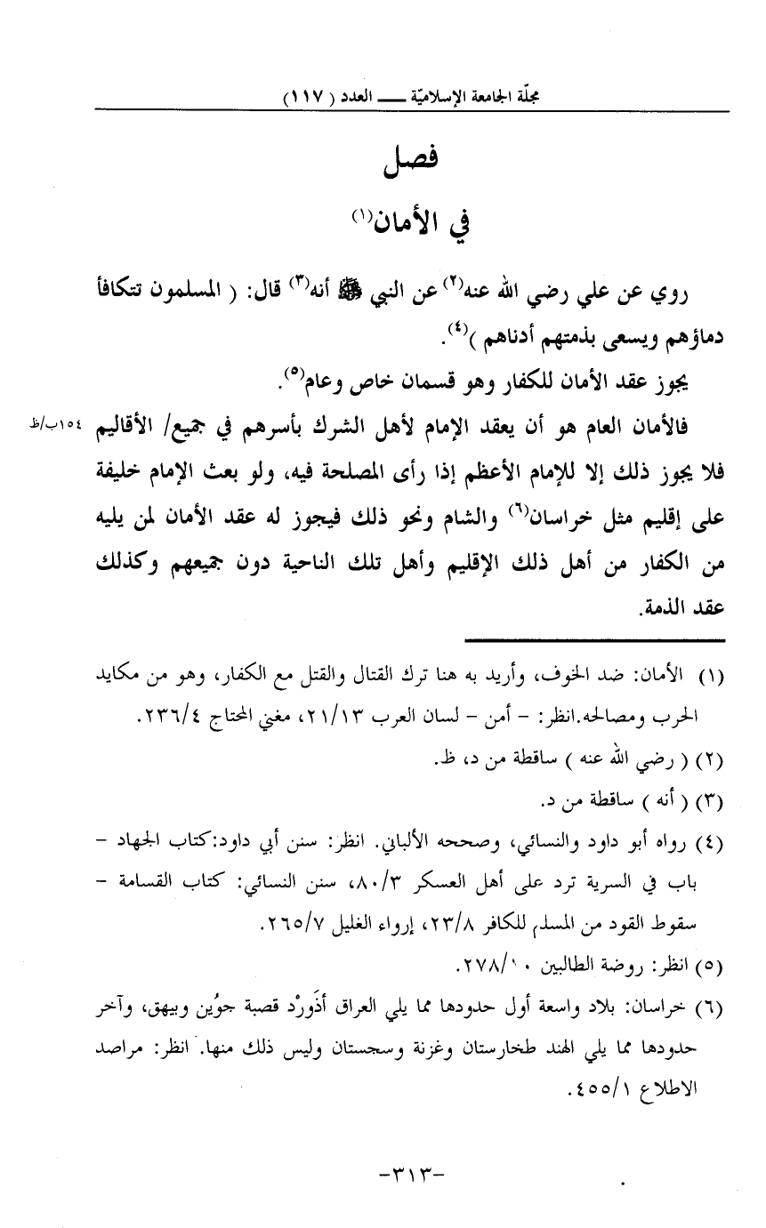 رُوِيَ عَن عَليّ رَضِي الله عَنهُ2 عَن النَّبِي صلى الله عَلَيْهِ وَسلم أَنه 3 قَالَ: "الْمُسلمُونَ تَتَكَافَأ دِمَاؤُهُمْ وَيسْعَى بِذِمَّتِهِمْ أَدْنَاهُم" 4.