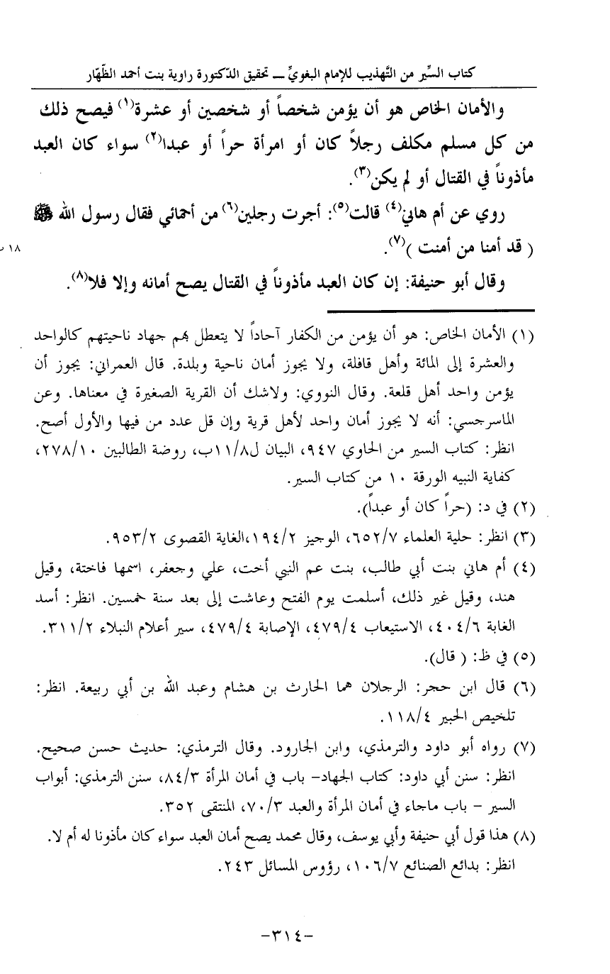 رُوِيَ عَن أم هاني 4 قَالَت 5: أجرت رجلَيْنِ 6 من أحمائي فَقَالَ رَسُول الله صلى الله عَلَيْهِ وَسلم: "قد أمنا من أمنت" 7.