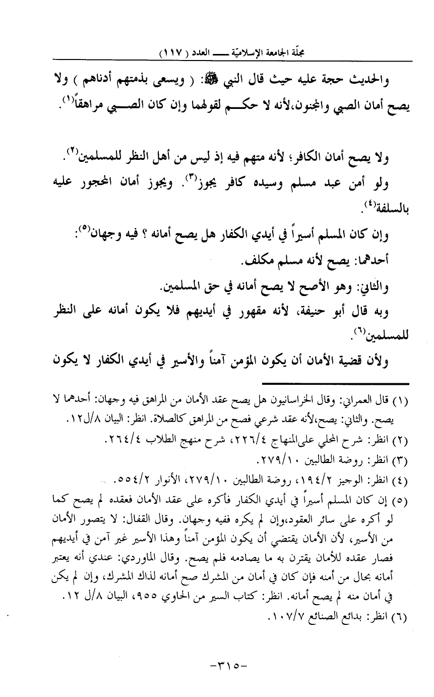 1 - قَالَ العمراني: "وَقَالَ الخراسانيون هَل يَصح عقد الْأمان من الْمُرَاهق فِيهِ وَجْهَان: أَحدهمَا لَا يَصح. وَالثَّانِي: يَصح، لِأَنَّهُ عقد شَرْعِي فصح من الْمُرَاهق كَالصَّلَاةِ". انْظُر: الْبَيَان 8/ل12.