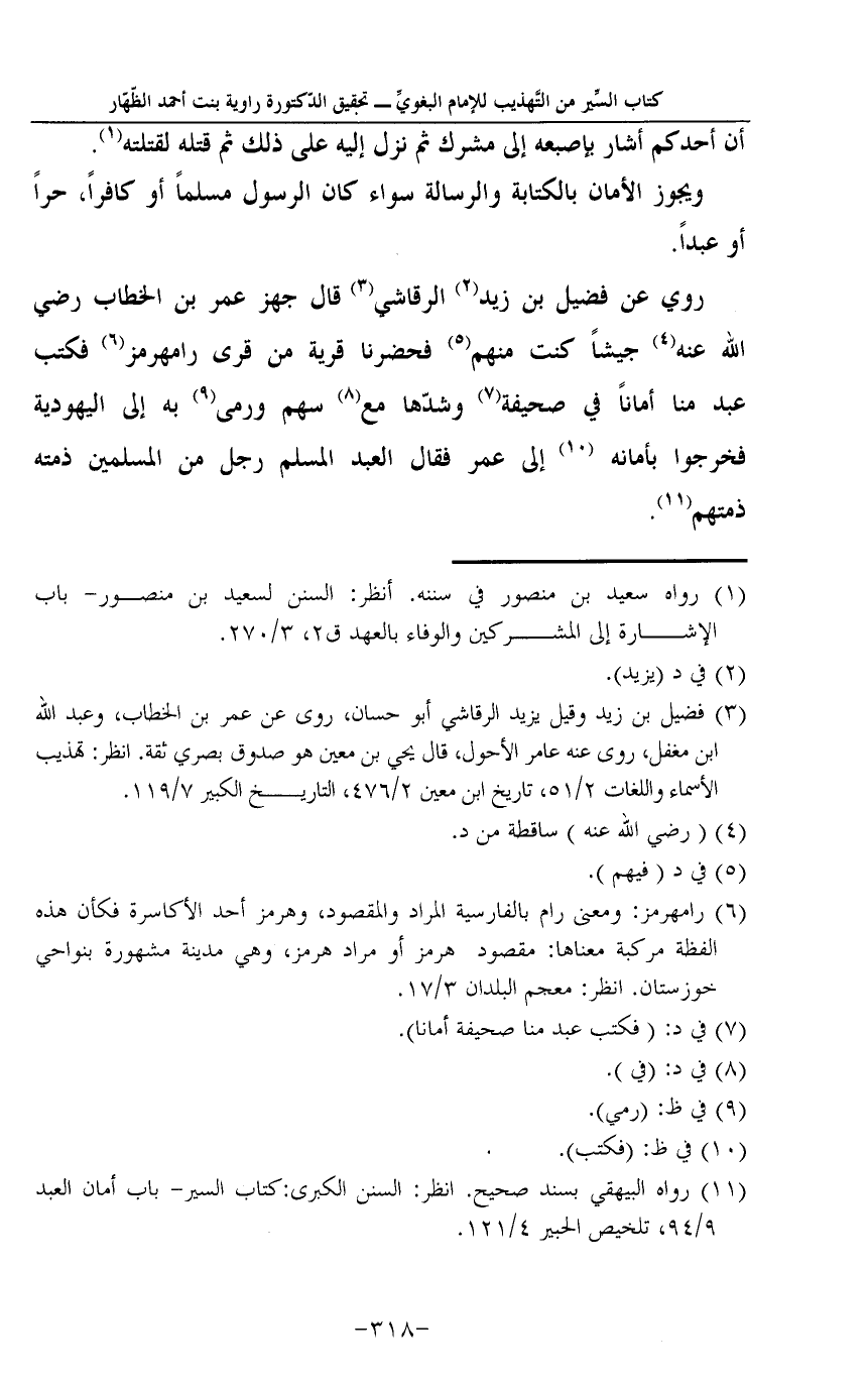 رُوِيَ عَن فُضَيْل بن زيد2 الرقاشِي3 قَالَ: "جهز عمر بن الْخطاب رَضِي الله عَنهُ4 جَيْشًا كنت مِنْهُم 5 فحضرنا قَرْيَة من قرى رامهرمز 6 فَكتب عبد منا أَمَانًا فِي صحيفَة 7 وشدّها مَعَ 8 سهم وَرمى 9 بِهِ إِلَى الْيَهُودِيَّة فَخَرجُوا بأمانه 10 إِلَى عمر فَقَالَ العَبْد الْمُسلم رجل من الْمُسلمين ذمَّته ذمتهم" 11.