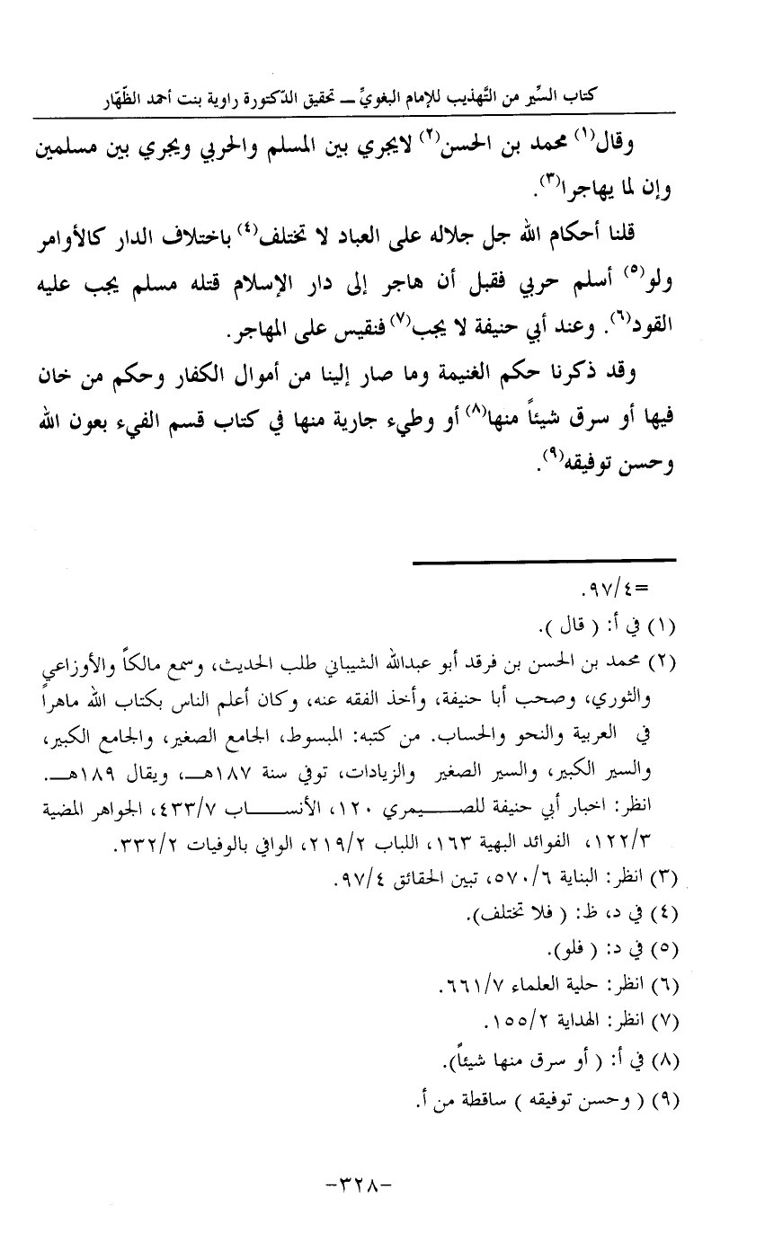 2 - مُحَمَّد بن الْحسن بن فرقد أَبُو عبد الله الشَّيْبَانِيّ طلب الحَدِيث، وَسمع مَالِكًا وَالْأَوْزَاعِيّ وَالثَّوْري، وَصَحب أَبَا حنيفَة، وَأخذ الْفِقْه عَن هـ، وَكَانَ أعلم النَّاس بِكِتَاب الله ماهراً فِي الْعَرَبيَّة والنحو والحساب. من كتبه: الْمَبْسُوط، الْجَامِع الصَّغِير، وَالْجَامِع الْكَبِير، وَالسير الْكَبِير، وَالسير الصَّغِير والزيادات، توفّي سنة 187هـ، وَيُقَال 189هـ. انْظُر: اخبار أبي حنيفَة للصيمري 120، الْأَنْسَاب 7/433، الْجَوَاهِر المضية 3/122، الْفَوَائِد البهية 163، اللّبَاب 2/219، الوافي بالوفيات 2/332.