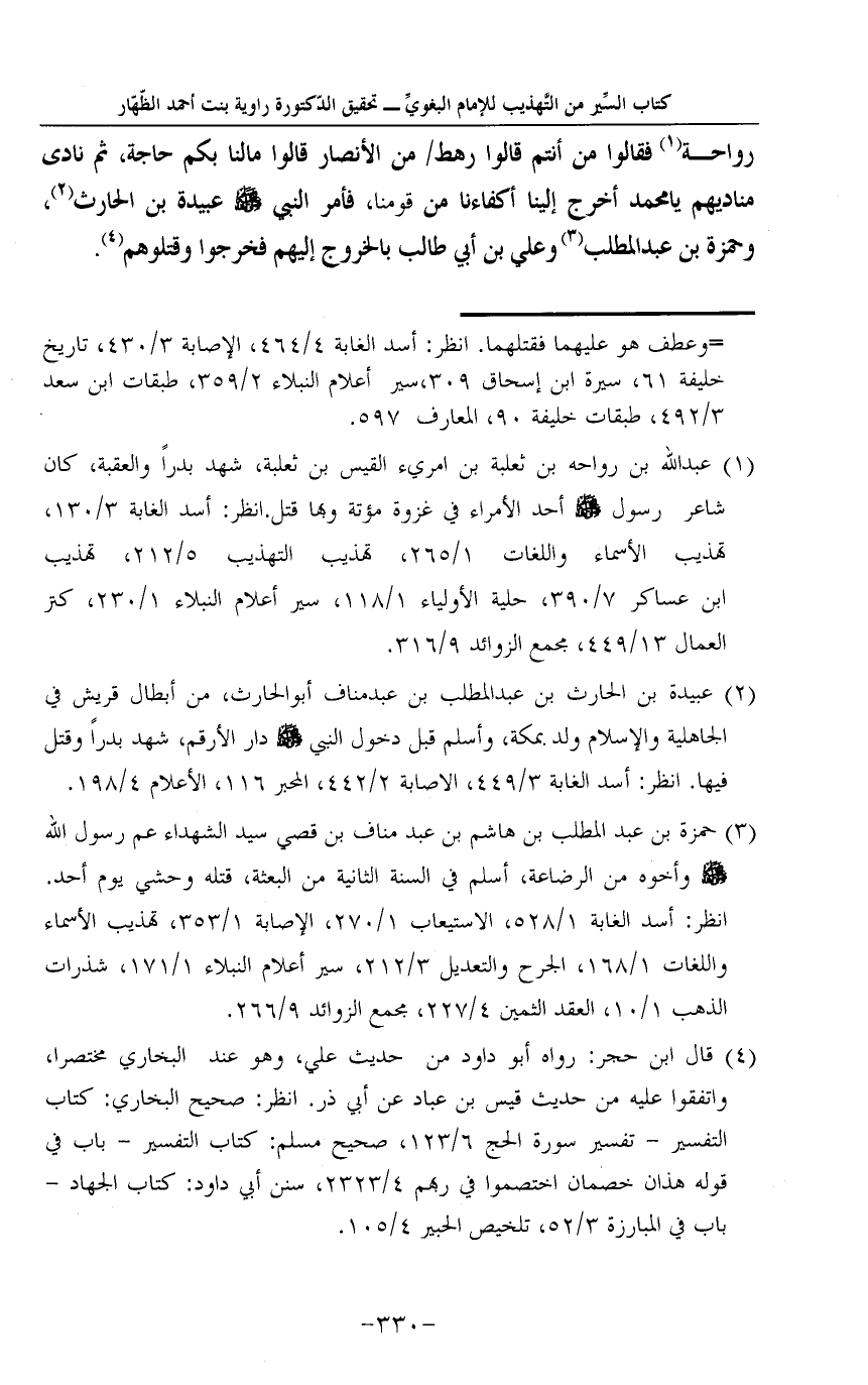 رَوَاحَة1 فَقَالُوا من أَنْتُم قَالُوا رَهْط من الْأَنْصَار قَالُوا مالنا بكم حَاجَة، ثمَّ نَادَى مناديهم يَا مُحَمَّد أخرج إِلَيْنَا أكفاءنا من قَومنَا، فَأمر النَّبِي صلى الله عَلَيْهِ وَسلم عُبَيْدَة بن الْحَارِث2، وَحَمْزَة بن عبد الْمطلب3 وَعلي بن أبي طَالب بِالْخرُوجِ إِلَيْهِم فَخَرجُوا وقتلوهم 4.