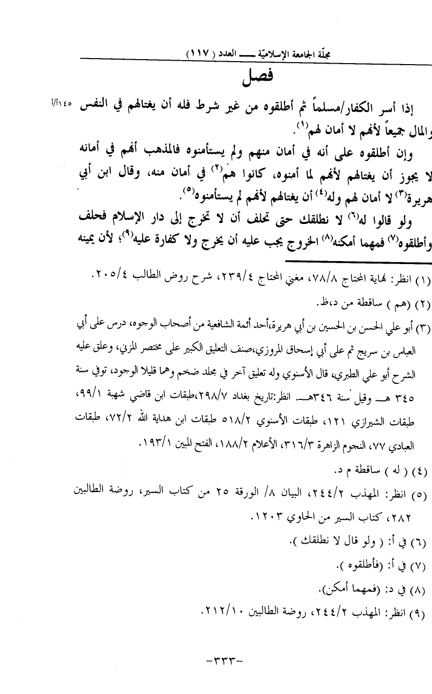 5 - انْظُر: الْمُهَذّب 2/244، الْبَيَان 8/ الورقة 25 من كتاب السّير، رَوْضَة الطالبين 282، كتاب السّير من الْحَاوِي 1203.