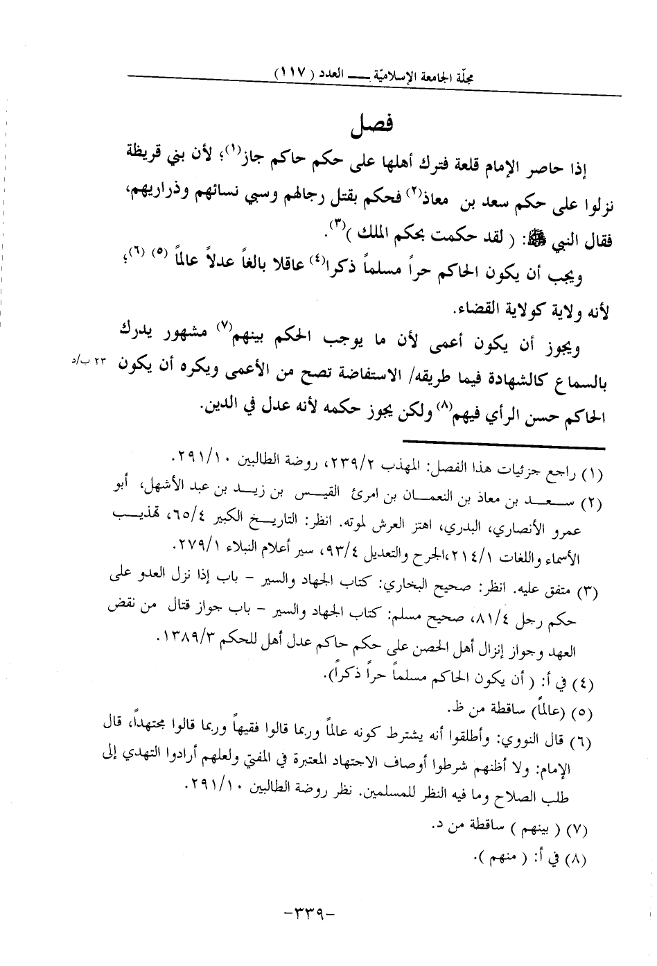 6 - قَالَ النَّوَوِيّ: "وأطلقوا أَنه يشْتَرط كَونه عَالما وَرُبمَا قَالُوا فَقِيها وَرُبمَا قَالُوا مُجْتَهدا "، قَالَ الإِمَام: "وَلَا أظنهم شرطُوا أَوْصَاف الِاجْتِهَاد الْمُعْتَبرَة فِي الْمُفْتِي ولعلهم أَرَادوا التهدي إِلَى طلب الصّلاح وَمَا فِيهِ النّظر للْمُسلمين". نظر رَوْضَة الطالبين 10/291.