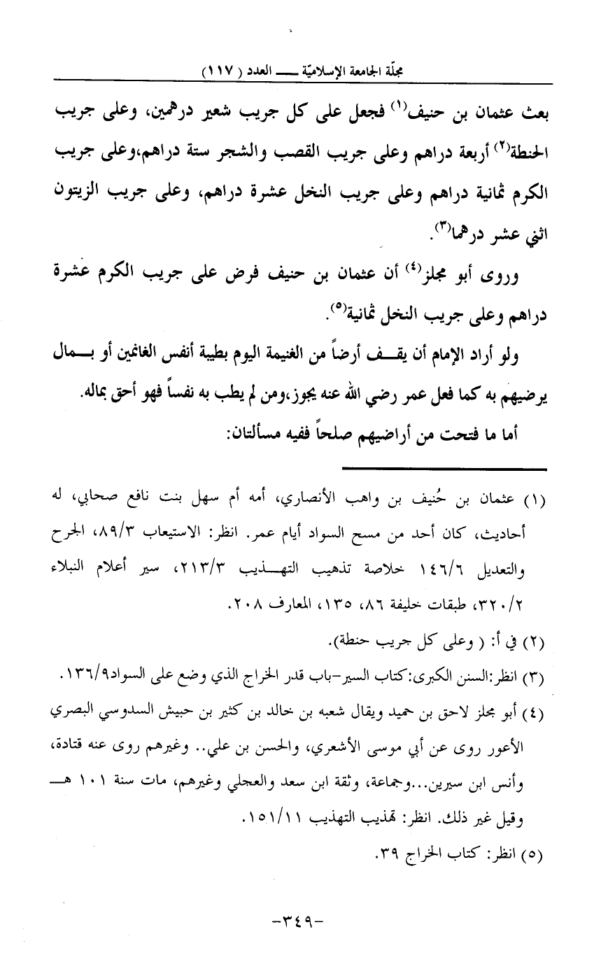 وروى أَبُو مجلز 4 أَن عُثْمَان بن حنيف فرض على جريب الْكَرم عشرَة دَرَاهِم وعَلى جريب النّخل ثَمَانِيَة 5.