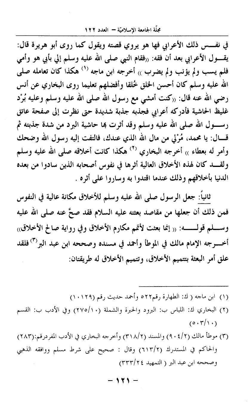 ثَانِيًا: جعل الرَّسُول صلى الله عَلَيْهِ وَسلم للأخلاق مكانة عالية فِي النُّفُوس فَمن ذَلِك أَن جعلهَا من مَقَاصِد بعثته عَلَيْهِ السَّلَام فقد صحَّ عَنهُ صلى الله عَلَيْهِ وَسلم قَوْله: ((إِنَّمَا بعثت لأتمم مَكَارِم الْأَخْلَاق وَفِي رِوَايَة صَالح الْأَخْلَاق)) أخرجه الإِمَام مَالك فِي الْمُوَطَّأ وَأحمد فِي مُسْنده وَصَححهُ ابْن عبد الْبر (3) فَلَقَد علق أَمر الْبعْثَة بتتميم الْأَخْلَاق، وتتميم الْأَخْلَاق لَهُ طريقتان: