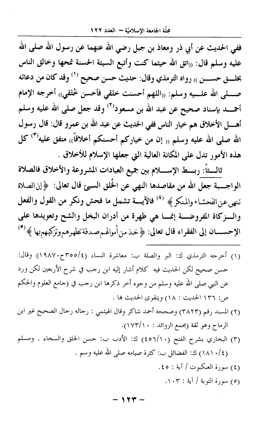 فَفِي الحَدِيث عَن أبي ذَر ومعاذ بن جبل رَضِي الله عَنْهُمَا عَن رَسُول الله صلى الله عَلَيْهِ وَسلم قَالَ: ((اتَّقِ الله حَيْثُمَا كنت وأتبع السَّيئَة الْحَسَنَة تمحها وخالق النَّاس بِخلق حسن)) رَوَاهُ التِّرْمِذِيّ وَقَالَ: حَدِيث حسن صَحِيح (1) وَقد كَانَ من دُعَائِهِ صلى الله عَلَيْهِ وَسلم: ((اللَّهُمَّ أَحْسَنت خلقي فَأحْسن خُلقي)) أخرجه الإِمَام أَحْمد بِإِسْنَاد صَحِيح عَن عبد الله بن مَسْعُود (2) وَقد جعل صلى الله عَلَيْهِ وَسلم أهل الْأَخْلَاق هم خِيَار النَّاس فَفِي الحَدِيث عَن عبد الله بن عَمْرو قَالَ: قَالَ رَسُول الله صلى الله عَلَيْهِ وَسلم ((إِن من خياركم أحسنكم أَخْلَاقًا)) مُتَّفق عَلَيْهِ (3) كل هَذِه الْأُمُور تدل على المكانة الْعَالِيَة الَّتِي جعلهَا الْإِسْلَام للأخلاق.