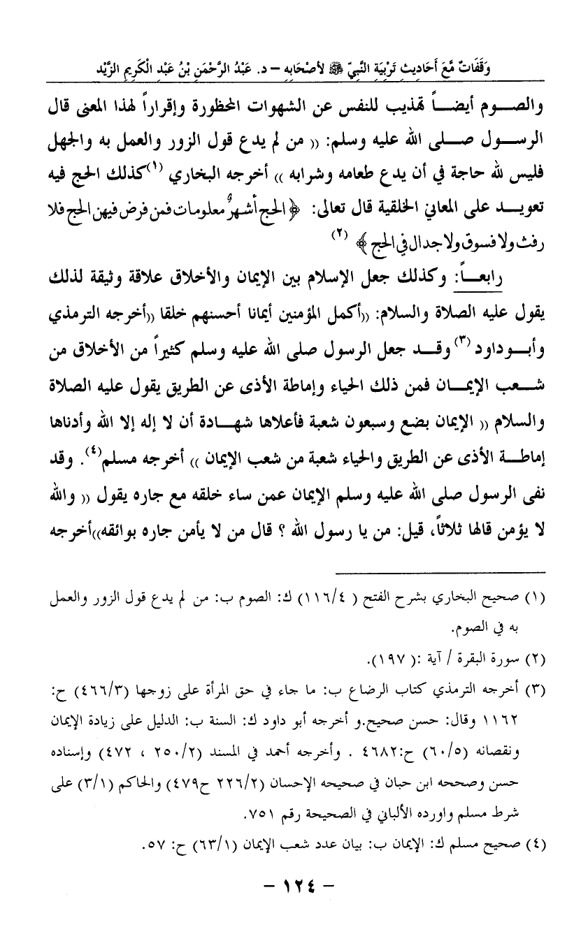 رَابِعا: وَكَذَلِكَ جعل الْإِسْلَام بَين الْإِيمَان والأخلاق علاقَة وَثِيقَة لذَلِك يَقُول عَلَيْهِ الصَّلَاة وَالسَّلَام: ((أكمل الْمُؤمنِينَ أيمانا أحْسنهم خلقا)) أخرجه التِّرْمِذِيّ وأبوداود (3) وَقد جعل الرَّسُول صلى الله عَلَيْهِ وَسلم كثيرا من الْأَخْلَاق من شعب الْإِيمَان فَمن ذَلِك الْحيَاء وإماطة الْأَذَى عَن الطَّرِيق يَقُول عَلَيْهِ الصَّلَاة وَالسَّلَام ((الْإِيمَان بضع وَسَبْعُونَ شُعْبَة فأعلاها شَهَادَة أَن لَا إِلَه إِلَّا الله وَأَدْنَاهَا إمَاطَة الْأَذَى عَن الطَّرِيق وَالْحيَاء شُعْبَة من شعب الْإِيمَان)) أخرجه مُسلم (4) . وَقد نفى الرَّسُول صلى الله عَلَيْهِ وَسلم الْإِيمَان عَمَّن سَاءَ خلقه مَعَ جَاره يَقُول ((وَالله لَا يُؤمن قَالَهَا ثَلَاثًا، قيل: من يَا رَسُول الله؟ قَالَ من لَا يَأْمَن جَاره بوائقه)) أخرجه