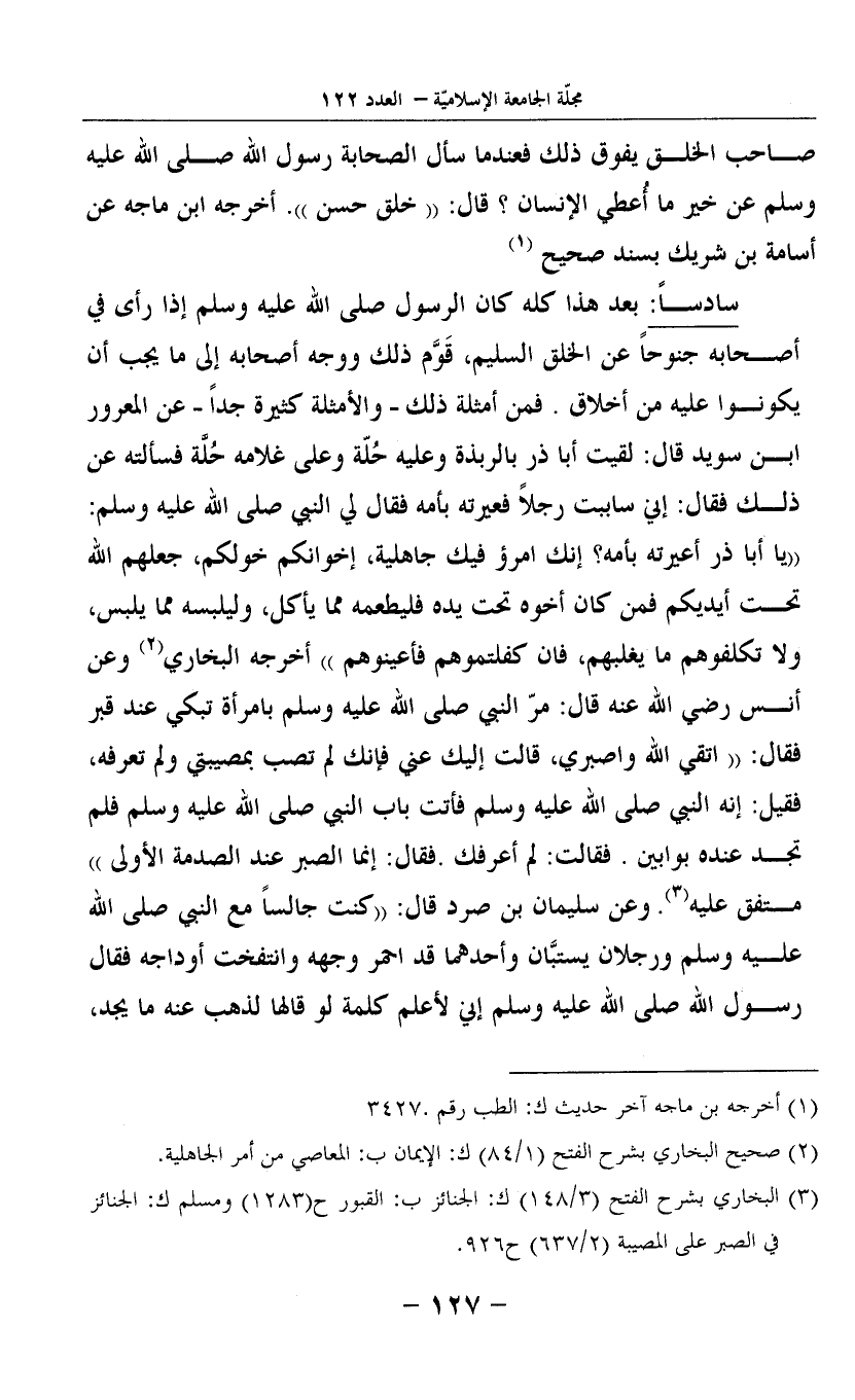 سادساً: بعد هَذَا كُله كَانَ الرَّسُول صلى الله عَلَيْهِ وَسلم إِذا رأى فِي أَصْحَابه جنوحاً عَن الْخلق السَّلِيم، قَوَّم ذَلِك وَوجه أَصْحَابه إِلَى مَا يجب أَن يَكُونُوا عَلَيْهِ من أَخْلَاق. فَمن أَمْثِلَة ذَلِك ـ والأمثلة كَثِيرَة جدا ـ عَن الْمَعْرُور ابْن سُوَيْد قَالَ: لقِيت أَبَا ذَر بالربذة وَعَلِيهِ حُلّة وعَلى غُلَامه حُلَّة فَسَأَلته عَن ذَلِك فَقَالَ: إِنِّي ساببت رجلا فَعَيَّرْته بِأُمِّهِ فَقَالَ لي النَّبِي صلى الله عَلَيْهِ وَسلم: ((يَا أَبَا ذَر أعيرته بِأُمِّهِ؟ إِنَّك امْرُؤ فِيك جَاهِلِيَّة، إخْوَانكُمْ خولكم، جعلهم الله تَحت أَيْدِيكُم فَمن كَانَ أَخُوهُ تَحت يَده فليطعمه مِمَّا يَأْكُل، وليلبسه مِمَّا يلبس، وَلَا تُكَلِّفُوهُمْ مَا يَغْلِبهُمْ، فان كفلتموهم فَأَعِينُوهُمْ)) أخرجه البُخَارِيّ (2) وَعَن أنس رَضِي الله عَنهُ قَالَ: مرّ النَّبِي صلى الله عَلَيْهِ وَسلم بِامْرَأَة تبْكي عِنْد قبر فَقَالَ: ((اتقِي الله واصبري، قَالَت إِلَيْك عني فَإنَّك لم تصب بمصيبتي وَلم تعرفه)) ، فَقيل: إِنَّه النَّبِي صلى الله عَلَيْهِ وَسلم فَأَتَت بَاب النَّبِي صلى الله عَلَيْهِ وَسلم فَلم تَجِد عِنْده بوابين. فَقَالَت: لم أعرفك. فَقَالَ: ((إِنَّمَا الصَّبْر عِنْد الصدمة الأولى)) مُتَّفق عَلَيْهِ (3) . وَعَن سُلَيْمَان بن صرد قَالَ: ((كنت جَالِسا مَعَ النَّبِي صلى الله عَلَيْهِ وَسلم ورجلان يستبَّان وَأَحَدهمَا قد احمر وَجهه وَانْتَفَخَتْ أوداجه فَقَالَ رَسُول الله صلى الله عَلَيْهِ وَسلم ((إِنِّي لأعْلم كلمة لَو قَالَهَا لذهب عَنهُ مَا يجد،