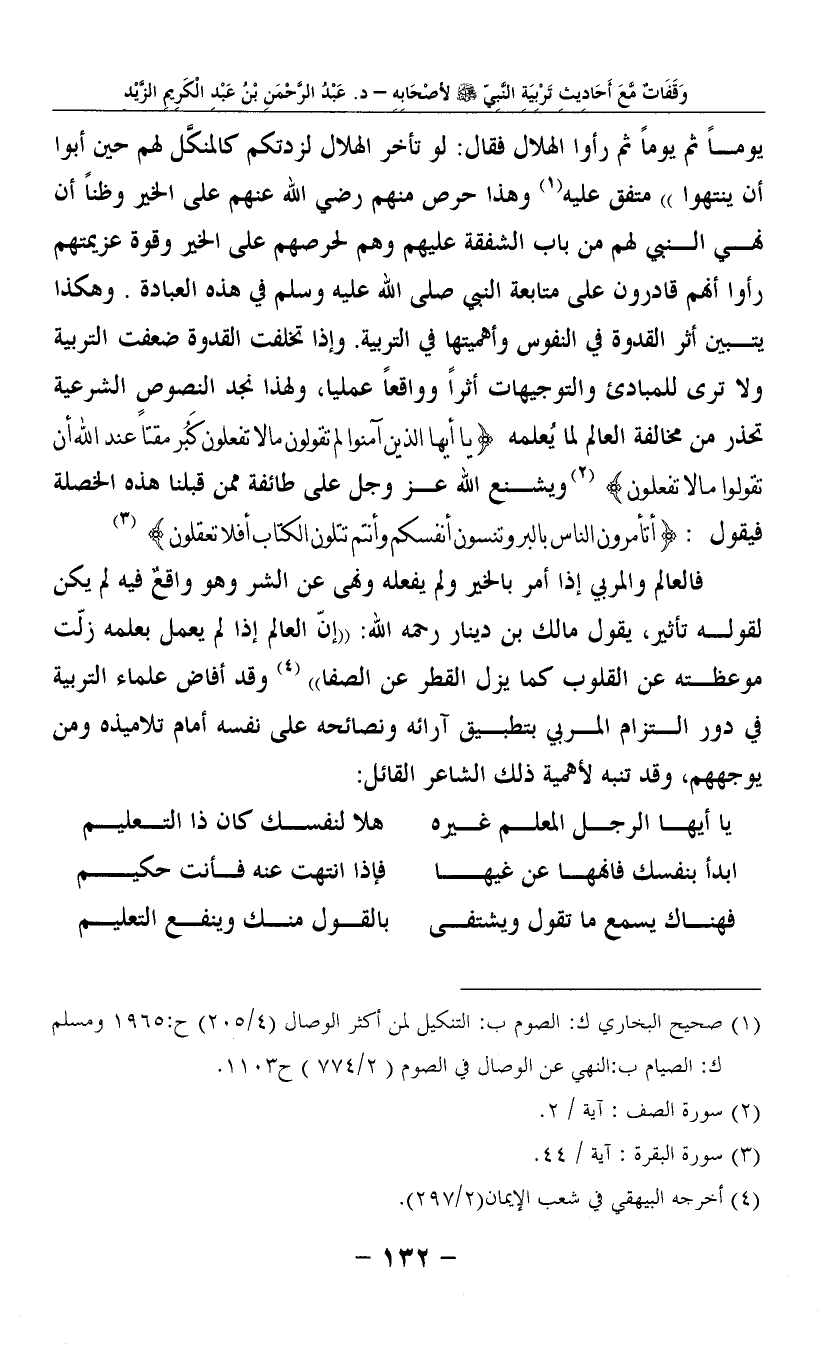 يَوْمًا ثمَّ يَوْمًا ثمَّ رَأَوْا الْهلَال فَقَالَ: ((لَو تَأَخّر الْهلَال لزدتكم كالمنكَّل لَهُم حِين أَبَوا أَن ينْتَهوا)) مُتَّفق عَلَيْهِ (1) وَهَذَا حرص مِنْهُم رَضِي الله عَنْهُم على الْخَيْر وظناً أَن نهي النَّبِي لَهُم من بَاب الشَّفَقَة عَلَيْهِم وهم لحرصهم على الْخَيْر وَقُوَّة عزيمتهم رَأَوْا أَنهم قادرون على مُتَابعَة النَّبِي صلى الله عَلَيْهِ وَسلم فِي هَذِه الْعِبَادَة. وَهَكَذَا يتَبَيَّن أثر الْقدْوَة فِي النُّفُوس وأهميتها فِي التربية. وَإِذا تخلفت الْقدْوَة ضعفت التربية وَلَا ترى للمبادئ والتوجيهات أثرا وواقعاً عمليا، وَلِهَذَا نجد النُّصُوص الشَّرْعِيَّة تحذر من مُخَالفَة الْعَالم لما يُعلمه {يَا أَيهَا الَّذين آمنُوا لم تَقولُونَ مَالا تَفْعَلُونَ كَبُر مقتاً عِنْد الله أَن تَقولُوا مَالا تَفْعَلُونَ} (2) ويشنع الله عز وَجل على طَائِفَة مِمَّن قبلنَا هَذِه الْخصْلَة فَيَقُول: {أتأمرون النَّاس بِالْبرِّ وتنسون أَنفسكُم وَأَنْتُم تتلون الْكتاب أَفلا تعقلون} (3)