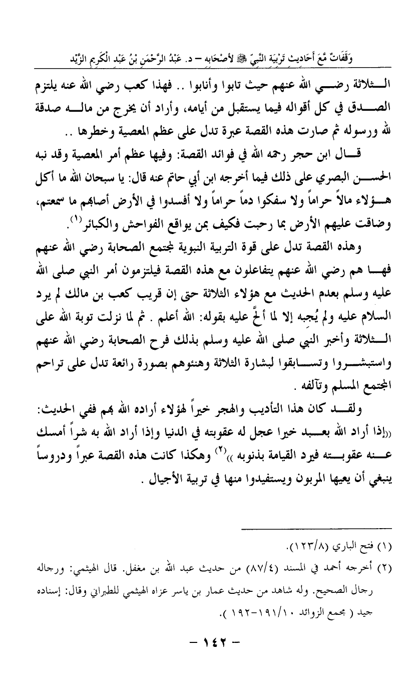 وَلَقَد كَانَ هَذَا التَّأْدِيب والهجر خيرا لهَؤُلَاء أَرَادَهُ الله بهم فَفِي الحَدِيث: ((إِذا أَرَادَ الله بِعَبْد خيرا عجل لَهُ عُقُوبَته فِي الدُّنْيَا وَإِذا أَرَادَ الله بِهِ شرا أمسك عَنهُ عُقُوبَته فَيرد الْقِيَامَة بذنوبه)) (2) وَهَكَذَا كَانَت هَذِه الْقِصَّة عبرا ودروساً يَنْبَغِي أَن يعيها المربون ويستفيدوا مِنْهَا فِي تربية الأجيال.