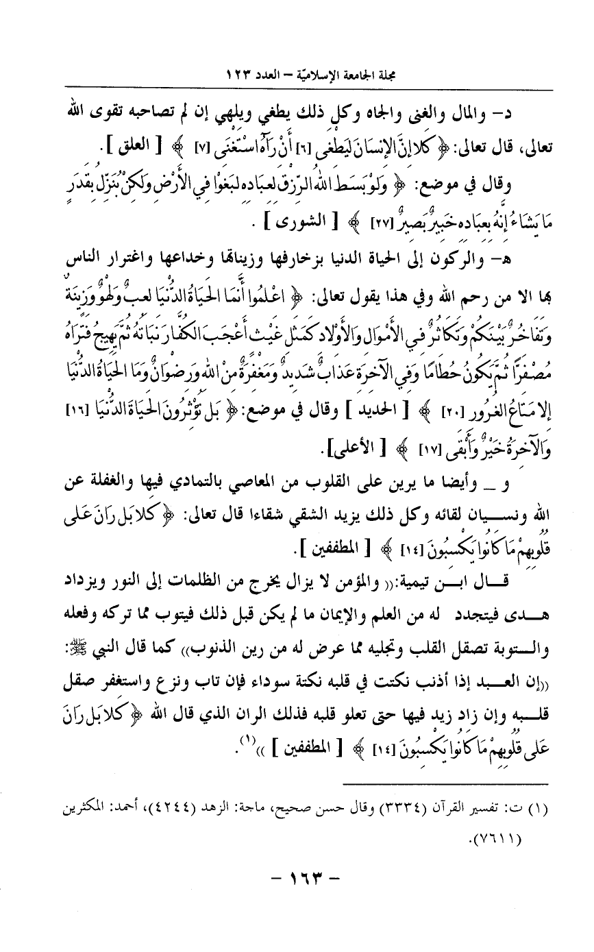 د- والمال والغنى والجاه وكل ذلك يطغي ويلهي إن لم تصاحبه تقوى الله تعالى، قال تعالى: {كَلا إِنَّ الإِنسَانَ ليَطْغَى أَنْ رَآهُ اسْتَغْنَى} [العلق:6-7] .