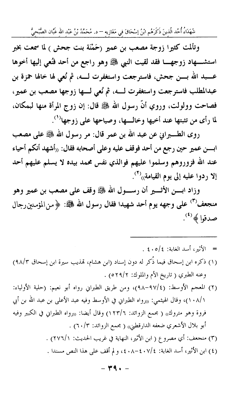 وزاد ابن الأثير أن رسول الله صلى الله عليه وسلم وقف على مصعب بن عمير وهو منجعف3 على وجهه يوم أحد شهيدا فقال رسول الله صلى الله عليه وسلم: {مِنَ الْمُؤْمِنِينَ رِجَالٌ صَدَقُوا} 4.