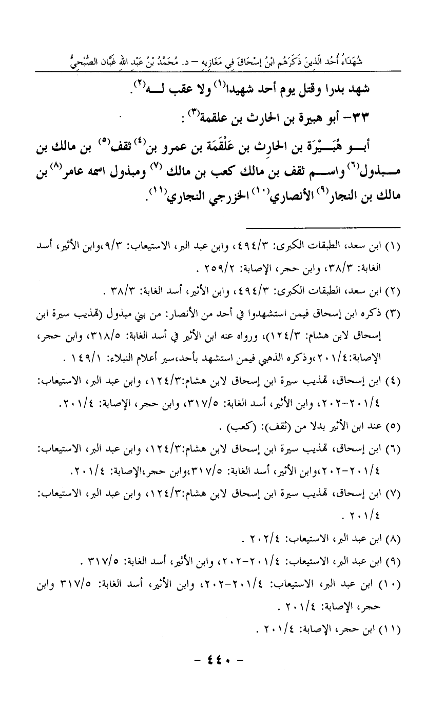 2 ابن إسحاق، تهذيب سيرة ابن إسحاق لابن هشام:3/124، وابن عبد البر، الاستيعاب: 4/201-202، وابن الأثير، أسد الغابة: 5/317، وابن حجر، الإصابة: 4/201.
