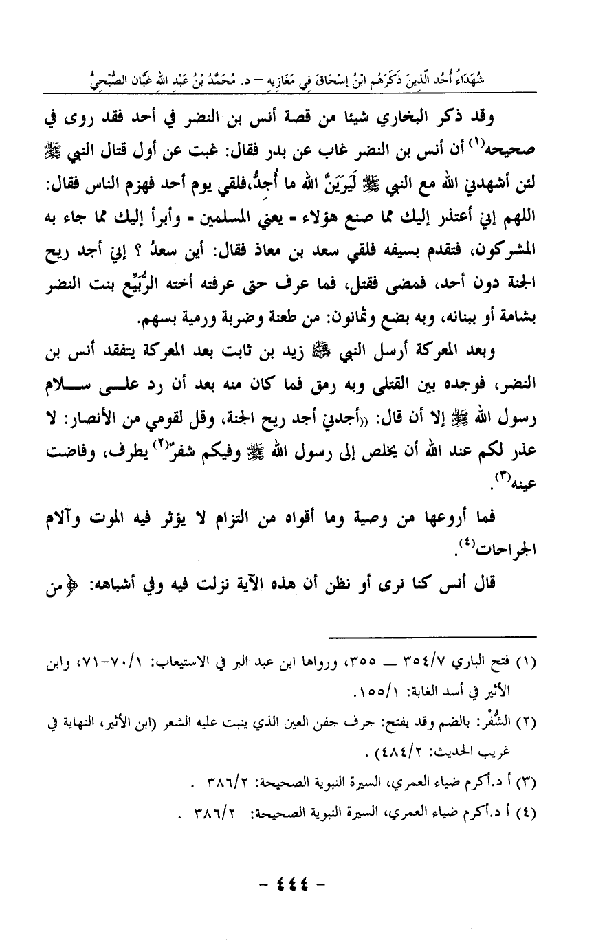 وقد ذكر البخاري شيئا من قصة أنس بن النضر في أحد فقد روى في صحيحه1 أن أنس بن النضر غاب عن بدر فقال: "غبت عن أول قتال النبي صلى الله عليه وسلم لئن أشهدني الله مع النبي صلى الله عليه وسلم لَيَرَيَنَّ الله ما أُجِدُّ، فلقي يوم أحد فهزم الناس فقال: اللهم إني أعتذر إليك مما صنع هؤلاء ـ يعني المسلمين ـ وأبرأ إليك مما جاء به المشركون، فتقدم بسيفه فلقي سعد بن معاذ فقال: أين سعدُ؟ إني أجد ريح الجنة دون أحد، فمضى فقتل، فما عرف حتى عرفته أخته الرُّبَيِّع بنت النضر بشامة أو ببنانه، وبه بضع وثمانون: من طعنة وضربة ورمية بسهم".