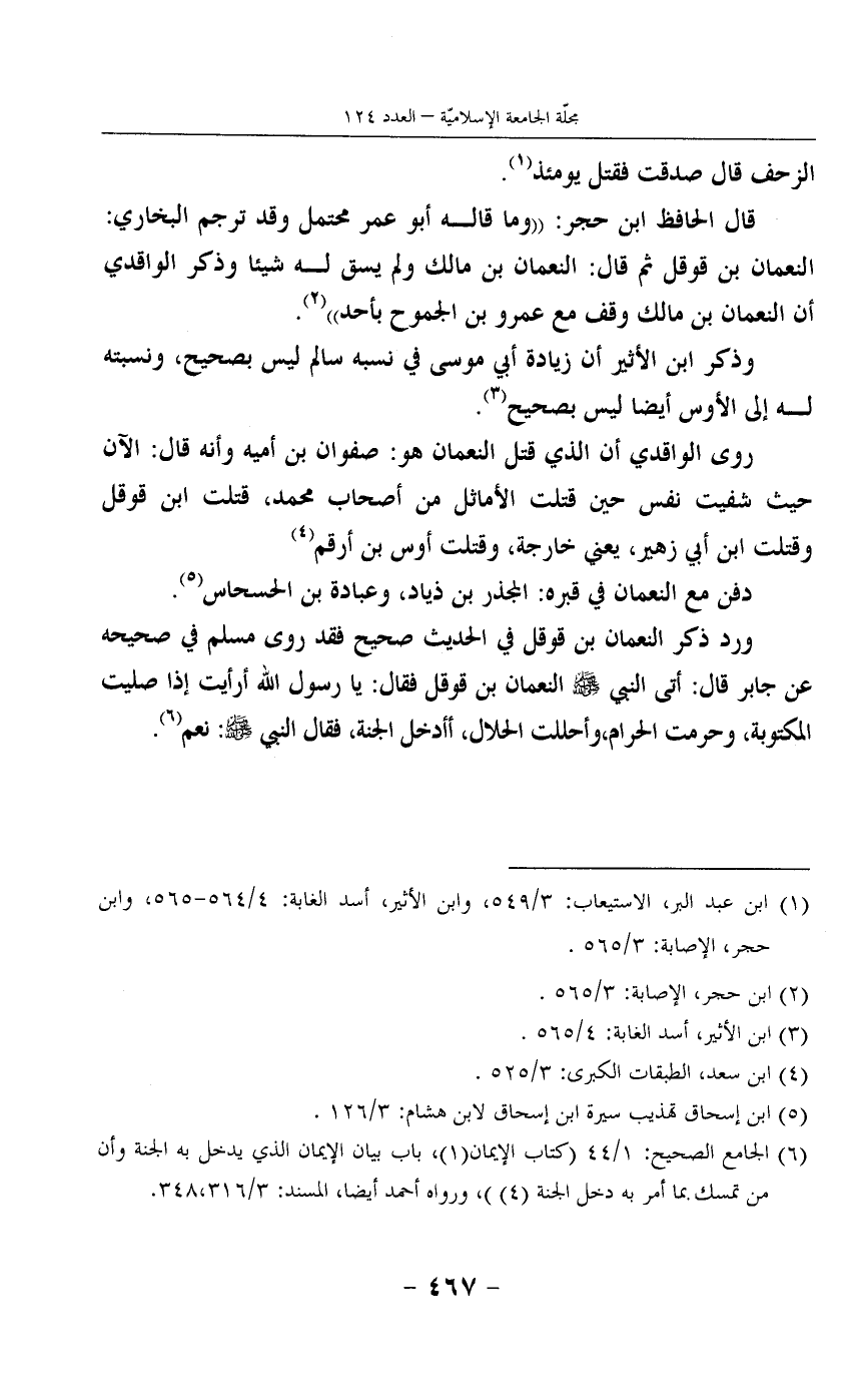 قال الحافظ ابن حجر: “وما قاله أبو عمر محتمل وقد ترجم البخاري: النعمان بن قوقل ثم قال: النعمان بن مالك ولم يسق له شيئا وذكر الواقدي أن النعمان بن مالك وقف مع عمرو بن الجموح بأحد”2.