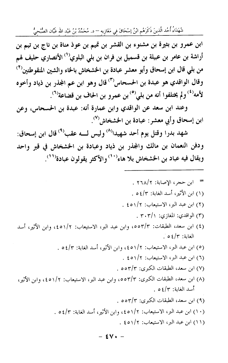 شهد بدرا وقتل يوم أحد شهيدا8 وليس له عقب9 قال ابن إسحاق: ودفن النعمان بن مالك والمجذر بن ذياد وعبادة بن الخشخاش في قبر واحد ويقال فيه عباد بن الخشخاش بلا هاء10 والأكثر يقولون عبادة11.