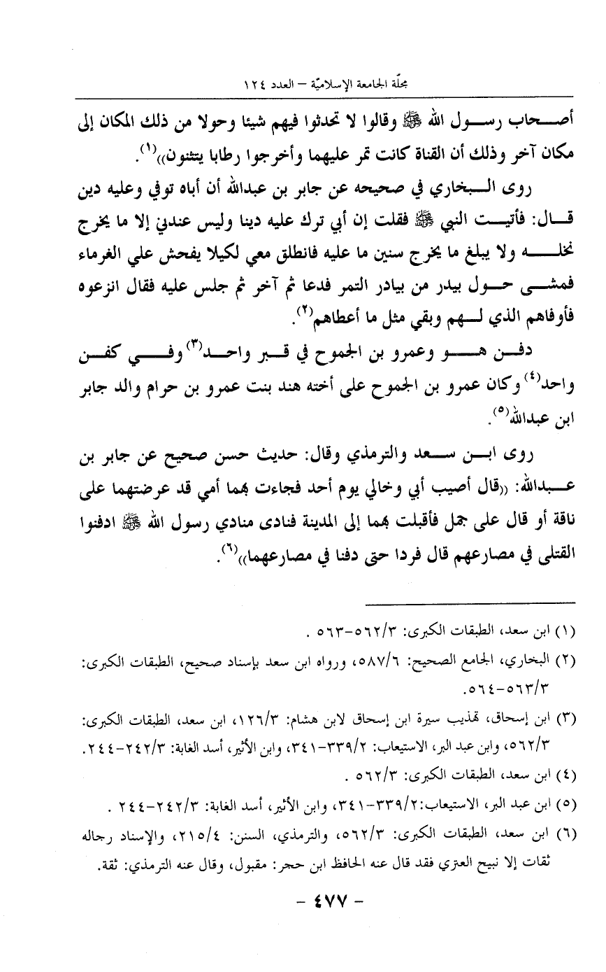 روى ابن سعد والترمذي وقال: حديث حسن صحيح عن جابر بن عبد الله: “قال أصيب أبي وخالي يوم أحد فجاءت بهما أمي قد عرضتهما على ناقة أو قال على جمل فأقبلت بهما إلى المدينة فنادى منادي رسول الله صلى الله عليه وسلم "ادفنوا القتلى في مصارعهم" قال فردا حتى دفنا في مصارعهما”6.