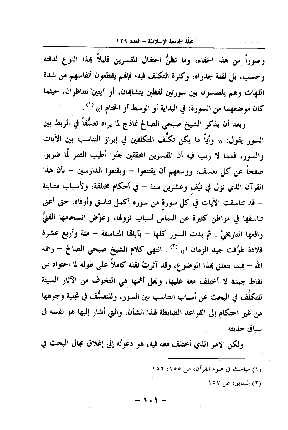 وَبعد أَن يذكر الشَّيْخ صبحي الصَّالح نماذج لما يرَاهُ تعسُّفاً فِي الرَّبْط بَين السُّور يَقُول: ((.. وأياً مَا يكن تكلُّف المتكلفين فِي إبراز التناسب بَين الْآيَات والسور، فمما لَا ريب فِيهِ أَن الْمُفَسّرين الْمُحَقِّقين جنَوا أطيب الثَّمر لمَّا ضربوا صفحاً عَن كل تعسف، ووسعهم أَن يقتنعوا - ويقنعوا الدارسين - بِأَن هَذَا الْقُرْآن الَّذِي نزل فِي نيِّفٍ وَعشْرين سنة - فِي أَحْكَام مُخْتَلفَة، ولأسباب متباينة - قد تناسقت الْآيَات فِي كل سورةٍ من سوره أكمل تناسق وأوفاه، حَتَّى أغْنى تناسقها فِي مَوَاطِن كَثِيرَة عَن التمَاس أَسبَاب نُزُولهَا، وعوَّض انسجامها الفنيُّ وَاقعهَا التاريخيَّ.. ثمَّ بَدَت السُّور كلهَا - بآياتها المتناسقة - مئة وَأَرْبع عشرَة قلادة طوَّقت جيد الزَّمَان} )) (2) . انْتهى كَلَام الشَّيْخ صبحي الصَّالح - رَحمَه الله - فِيمَا يتَعَلَّق بِهَذَا الْمَوْضُوع، وَقد آثرتُ نَقله كَامِلا على طوله لما احتواه من نقاط جَيِّدَة لَا أختلف مَعَه عَلَيْهَا، وَلَعَلَّ أهمها هِيَ التخوف من الْآثَار السَّيئَة للتكلُّف فِي الْبَحْث عَن أَسبَاب التناسب بَين السُّور، وللتعسُّف فِي تجلية وجوهها.. من غير احتكام إِلَى الْقَوَاعِد الضابطة لهَذَا الشَّأْن، وَالَّتِي أَشَارَ إِلَيْهَا هُوَ نَفسه فِي سِيَاق حَدِيثه.