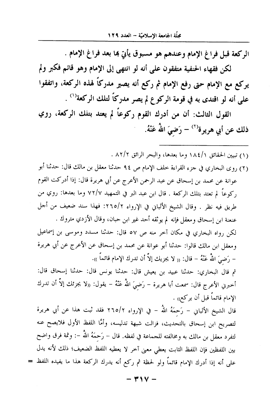 (2) روى البخاري في جزء القراءة خلف الإمام ص 94 حدثنا معقل بن مالك قال: حدثنا أبو عوانة عن محمد بن إسحاق عن عبد الرحمن الأعرج عن أبي هريرة قال: إذا أدركت القوم ركوعاً لم تعتد بتلك الركعة. قال ابن عبد البر في التمهيد 7/72 وما بعدها: روي من طريق فيه نظر. وقال الشيخ الألباني في الإرواء 2/265: فهذا سند ضعيف من أجل عنعنة ابن إسحاق ومعقل فإنه لم يوثقه أحد غير ابن حبان، وقال الأزدي متروك.