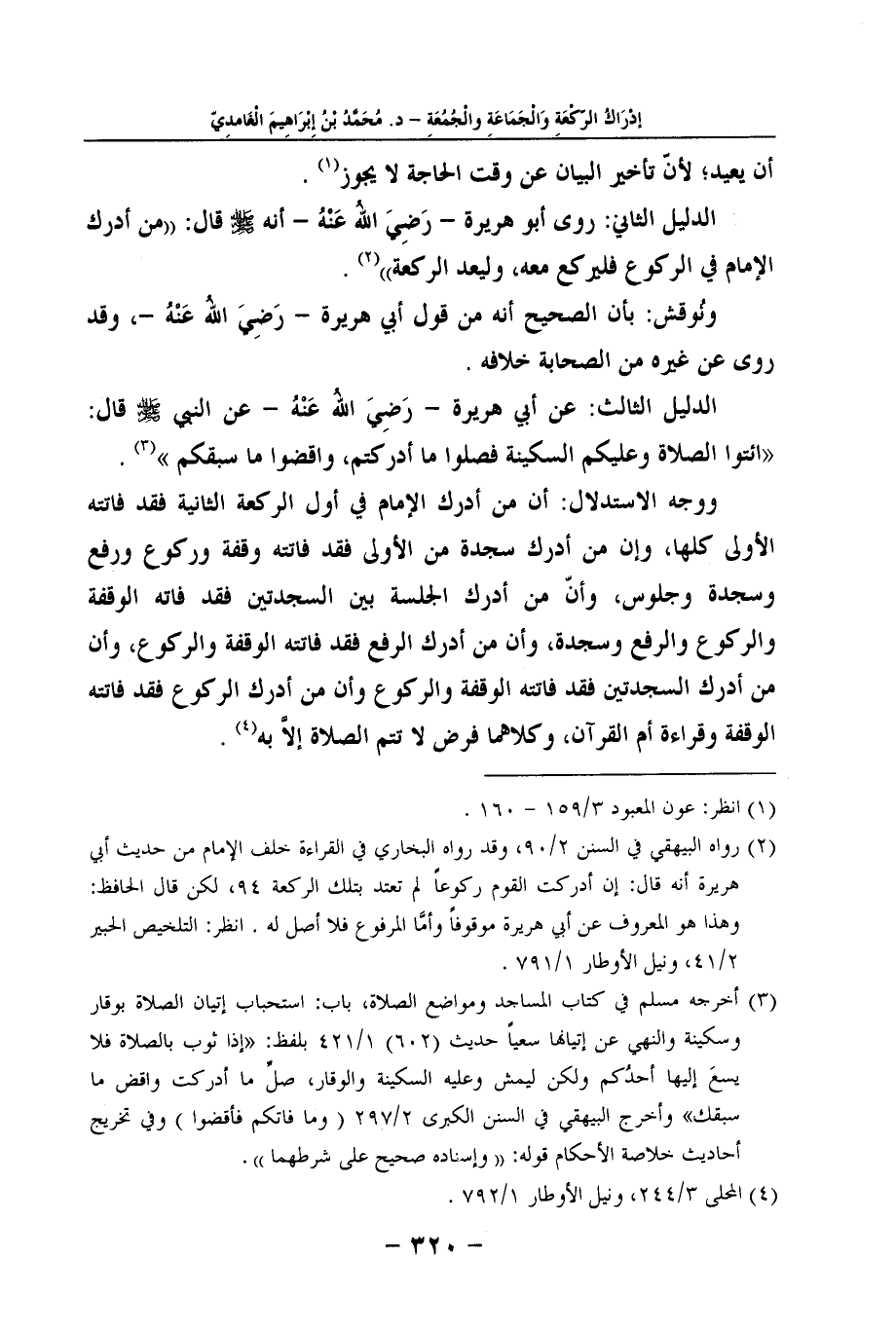 ووجه الاستدلال: أن من أدرك الإمام في أول الركعة الثانية فقد فاتته الأولى كلها، وإن من أدرك سجدة من الأولى فقد فاتته وقفة وركوع ورفع وسجدة وجلوس، وأنّ من أدرك الجلسة بين السجدتين فقد فاته الوقفة والركوع والرفع وسجدة، وأن من أدرك الرفع فقد فاتته الوقفة والركوع، وأن من أدرك السجدتين فقد فاتته الوقفة والركوع وأن من أدرك الركوع فقد فاتته الوقفة وقراءة أم القرآن، وكلاهما فرض لا تتم الصلاة إلاَّ به (4) .