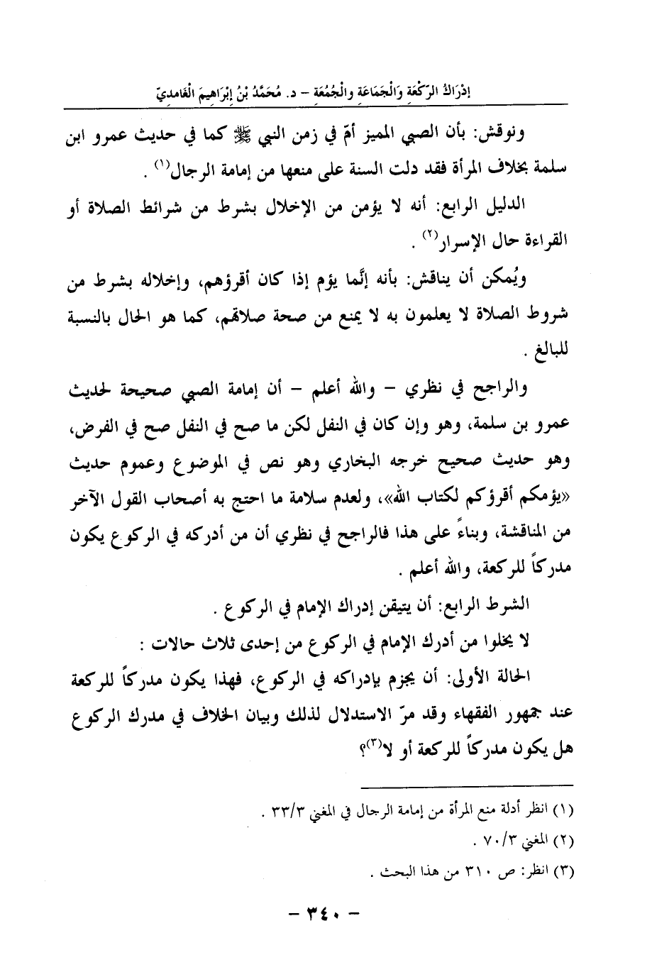 والراجح في نظري - والله أعلم - أن إمامة الصبي صحيحة لحديث عمرو بن سلمة، وهو وإن كان في النفل لكن ما صح في النفل صح في الفرض، وهو حديث صحيح خرجه البخاري وهو نص في الموضوع وعموم حديث "يؤمكم أقرؤكم لكتاب الله"، ولعدم سلامة ما احتج به أصحاب القول الآخر من المناقشة، وبناءً على هذا فالراجح في نظري أن من أدركه في الركوع يكون مدركاً للركعة، والله أعلم.