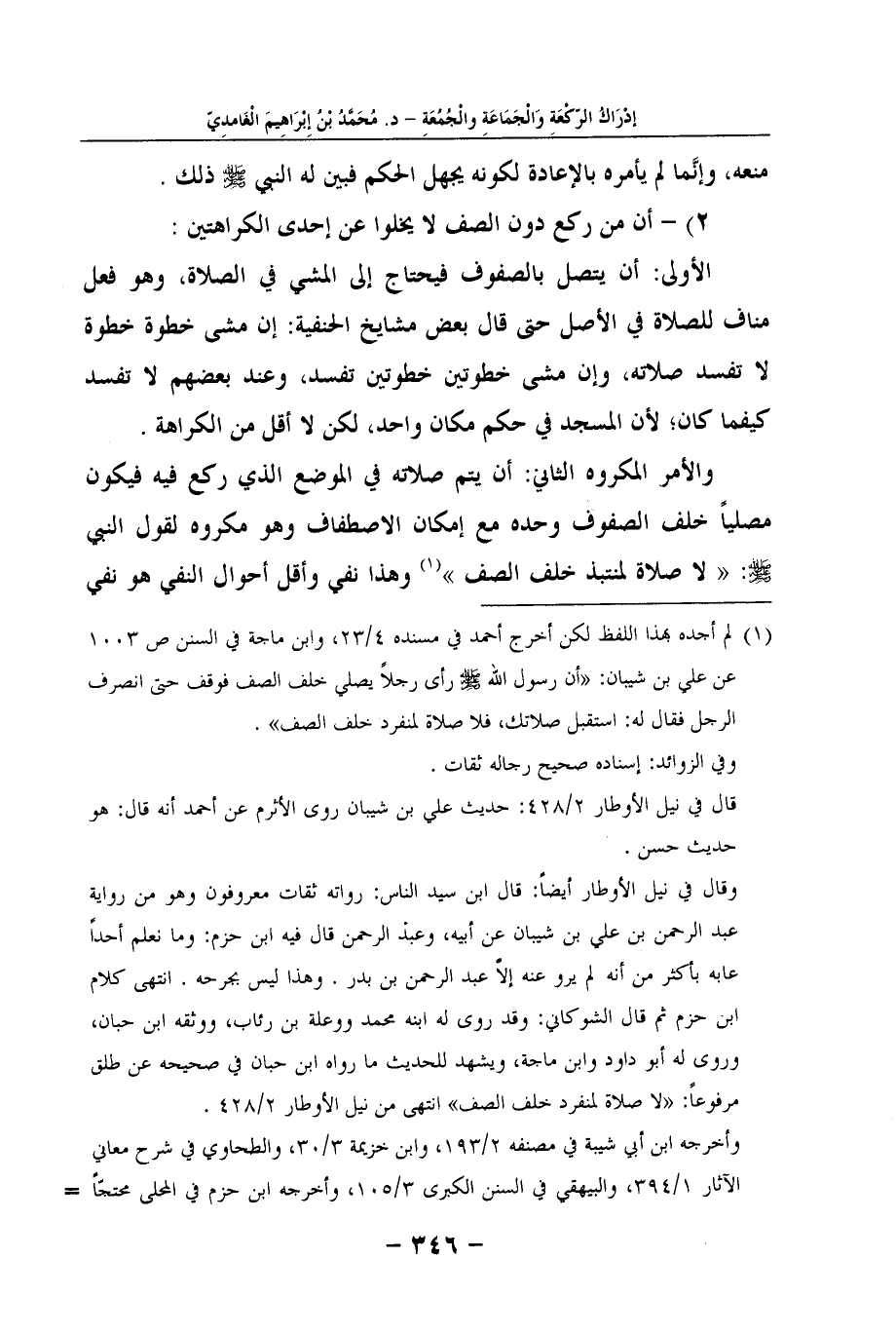 والأمر المكروه الثاني: أن يتم صلاته في الموضع الذي ركع فيه فيكون مصلياً خلف الصفوف وحده مع إمكان الاصطفاف وهو مكروه لقول النبي صلى الله عليه وسلم: " لا صلاة لمنتبذ خلف الصف " (1) وهذا نفي وأقل أحوال النفي هو نفي