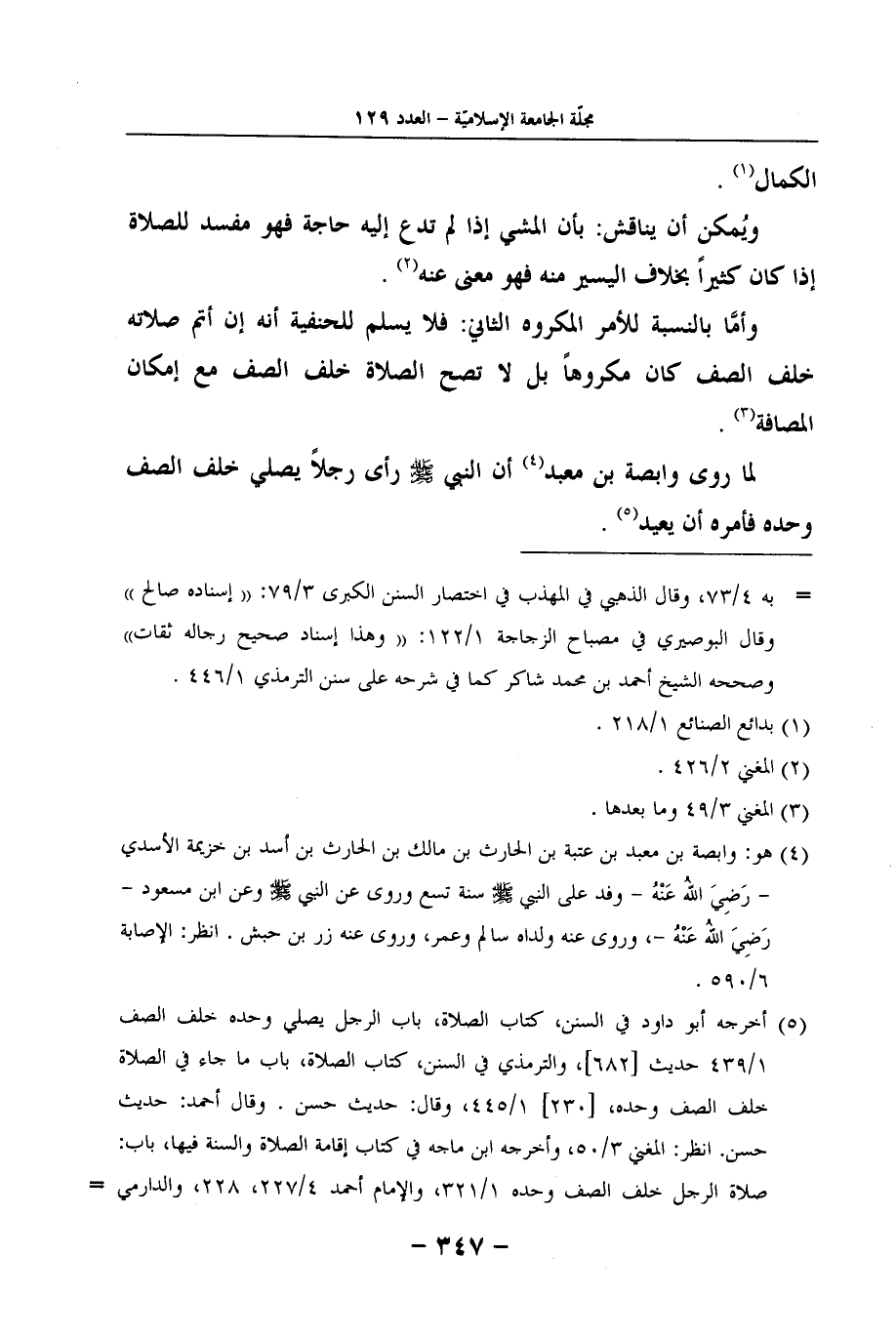 (5) أخرجه أبو داود في السنن، كتاب الصلاة، باب الرجل يصلي وحده خلف الصف 1/439 حديث [682] ، والترمذي في السنن، كتاب الصلاة، باب ما جاء في الصلاة خلف الصف وحده، [230] 1/445، وقال: حديث حسن. وقال أحمد: حديث حسن. انظر: المغني 3/50، وأخرجه ابن ماجه في كتاب إقامة الصلاة والسنة فيها، باب: صلاة الرجل خلف الصف وحده 1/321، والإمام أحمد 4/227، 228، والدارمي 1/237، وابن الجارود في المنتقى 117، وابن أبي شيبة في مصنفه 2/192، والدارقطني 1/362، 363، وابن خزيمة 3/30، وابن حزم في المحلى محتجاً به 4/72 - 74، والطحاوي في شرح معاني الآثار 1/393، وصححه الشيخ أحمد بن محمد شاكر كما في شرحه على سنن الترمذي 1/393.