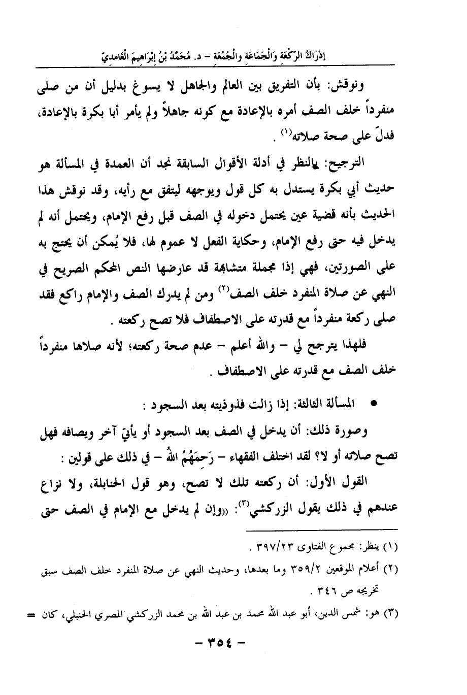 الترجيح: بالنظر في أدلة الأقوال السابقة نجد أن العمدة في المسألة هو حديث أبي بكرة يستدل به كل قول ويوجهه ليتفق مع رأيه، وقد نوقش هذا الحديث بأنه قضية عين يحتمل دخوله في الصف قبل رفع الإمام، ويحتمل أنه لم يدخل فيه حتى رفع الإمام، وحكاية الفعل لا عموم لها، فلا يُمكن أن يحتج به على الصورتين، فهي إذا مجملة متشابهة قد عارضها النص المحكم الصريح في النهي عن صلاة المنفرد خلف الصف (2) ومن لم يدرك الصف والإمام راكع فقد صلى ركعة منفرداً مع قدرته على الاصطفاف فلا تصح ركعته.