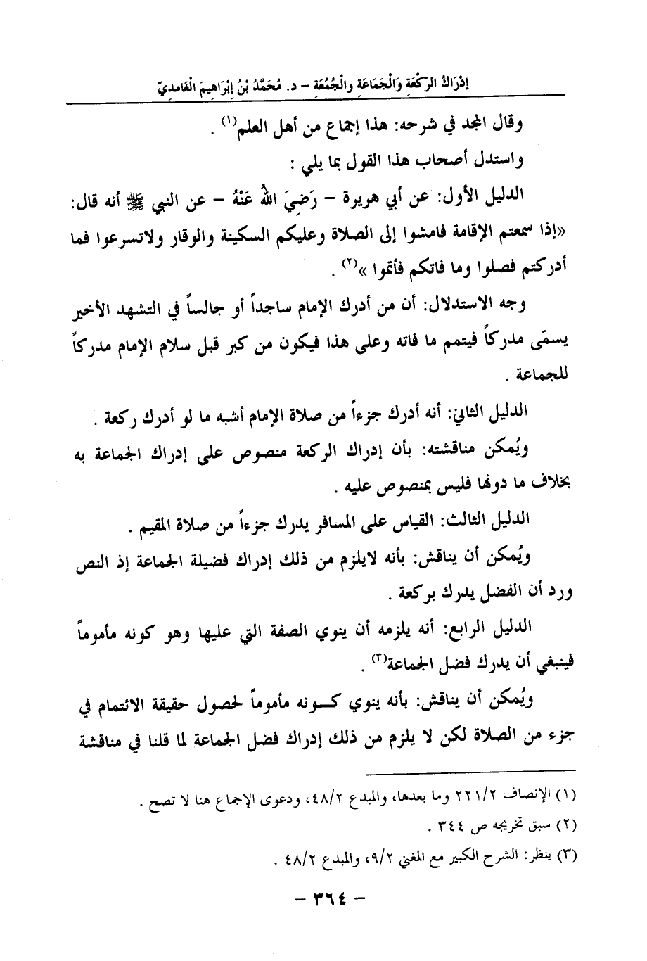 الدليل الأول: عن أبي هريرة - رَضِيَ اللهُ عَنْهُ - عن النبي صلى الله عليه وسلم أنه قال: "إذا سمعتم الإقامة فامشوا إلى الصلاة وعليكم السكينة والوقار ولاتسرعوا فما أدركتم فصلوا وما فاتكم فأتموا " (2) .