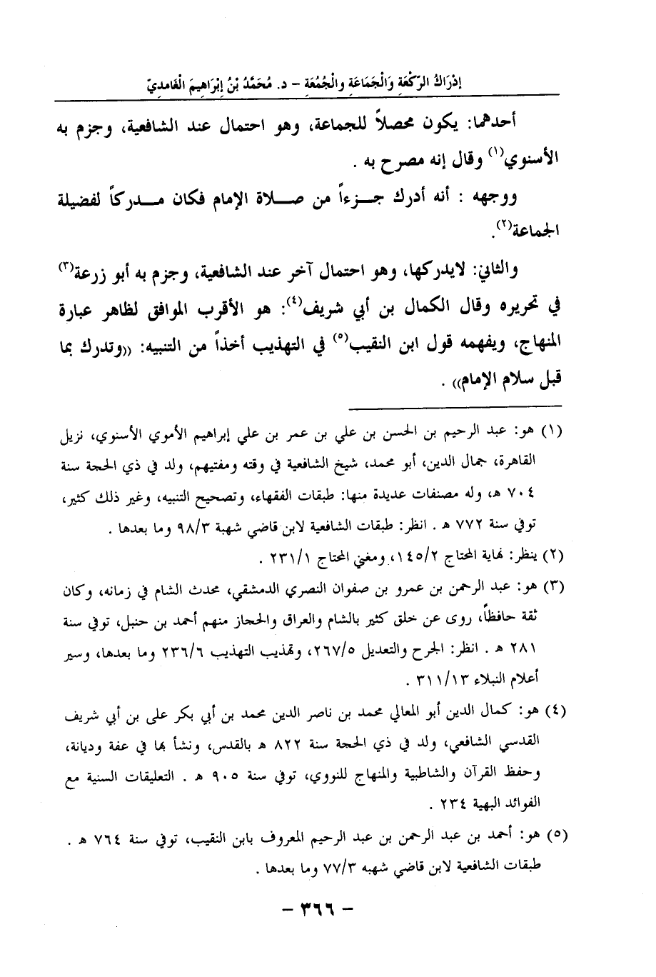 والثاني: لايدركها، وهو احتمال آخر عند الشافعية، وجزم به أبو زرعة (3) في تحريره وقال الكمال بن أبي شريف (4) :هو الأقرب الموافق لظاهر عبارة المنهاج، ويفهمه قول ابن النقيب (5) في التهذيب أخذاً من التنبيه: ((وتدرك بما قبل سلام الإمام)) .