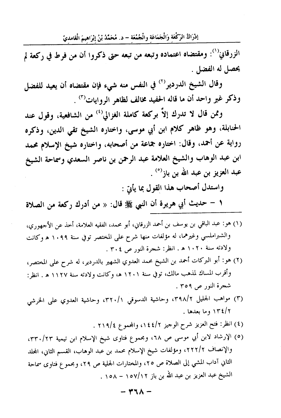 وممن قال لا تدرك إلاَّ بركعة كاملة الغزالي (4) من الشافعية، وقول عند الحنابلة، وهو ظاهر كلام ابن أبي موسى، واختاره الشيخ تقي الدين، وذكره رواية عن أحمد، وقال: اختاره جماعة من أصحابه، واختاره شيخ الإسلام محمد ابن عبد الوهاب والشيخ العلامة عبد الرحمن بن ناصر السعدي وسماحة الشيخ عبد العزيز بن عبد الله بن باز (5) .