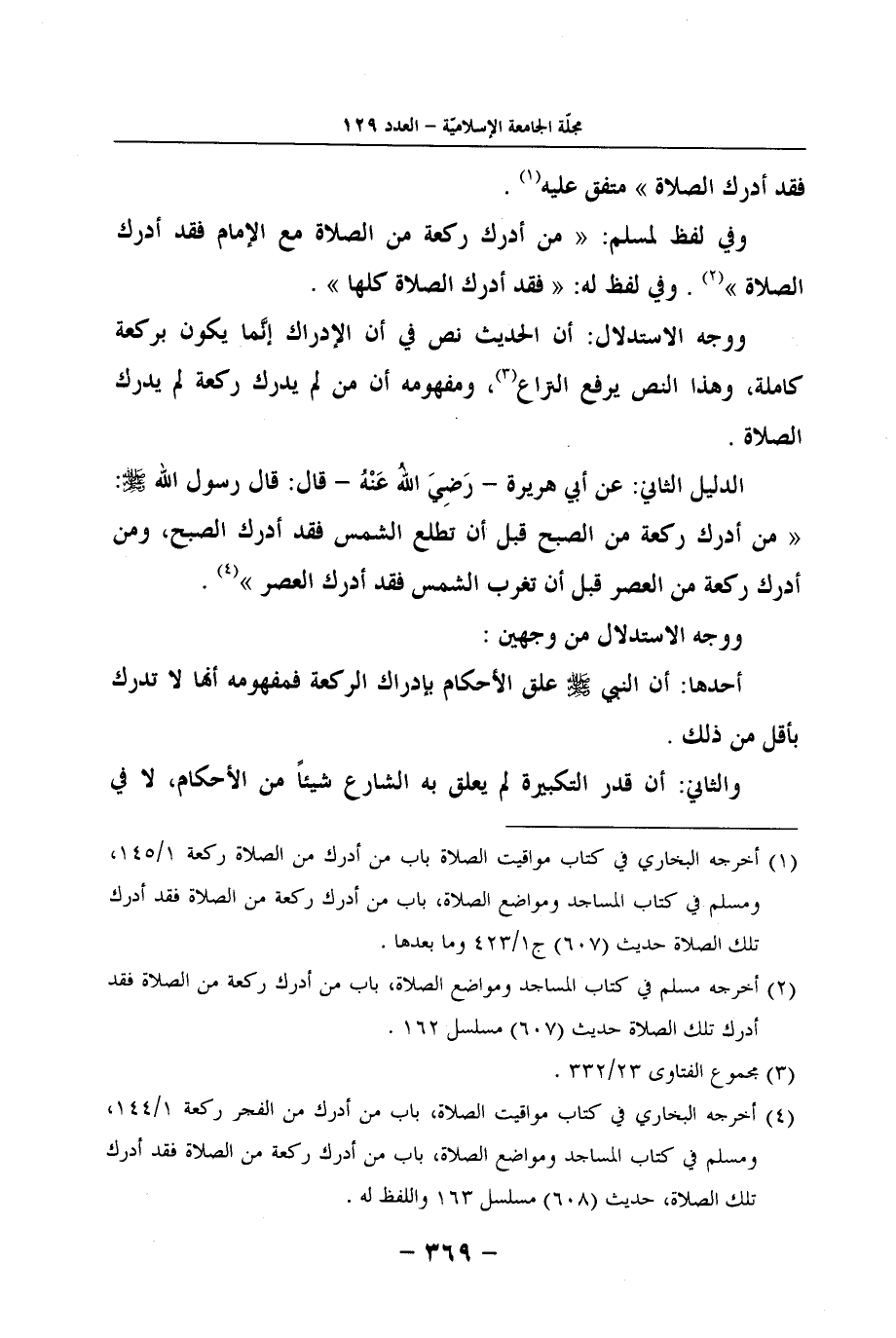 (1) أخرجه البخاري في كتاب مواقيت الصلاة باب من أدرك من الصلاة ركعة 1/145، ومسلم في كتاب المساجد ومواضع الصلاة، باب من أدرك ركعة من الصلاة فقد أدرك تلك الصلاة حديث (607) ج1/423 وما بعدها.