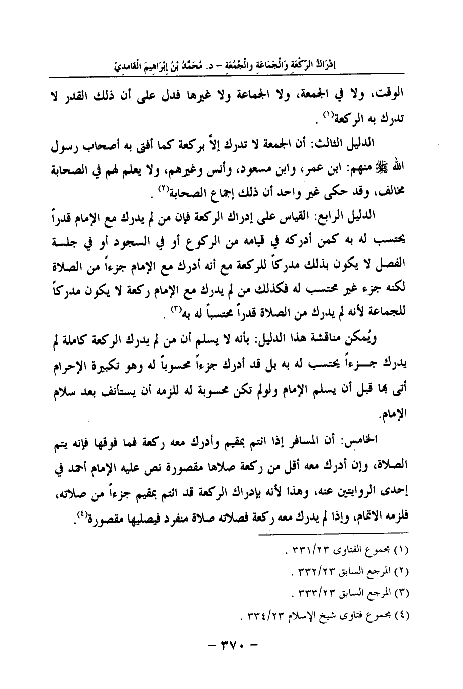 الدليل الثالث: أن الجمعة لا تدرك إلاَّ بركعة كما أفتى به أصحاب رسول الله صلى الله عليه وسلم منهم: ابن عمر، وابن مسعود، وأنس وغيرهم، ولا يعلم لهم في الصحابة مخالف، وقد حكى غير واحد أن ذلك إجماع الصحابة (2) .