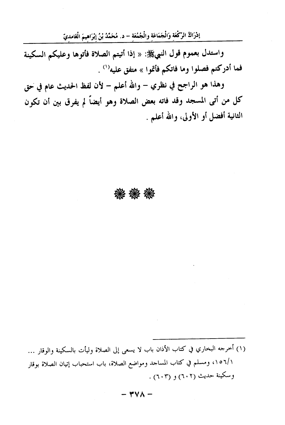 (1) أخرجه البخاري في كتاب الأذان باب لا يسعى إلى الصلاة وليأت بالسكينة والوقار ... 1/156، ومسلم في كتاب المساجد ومواضع الصلاة، باب استحباب إتيان الصلاة بوقار وسكينة حديث (602) و (603) .