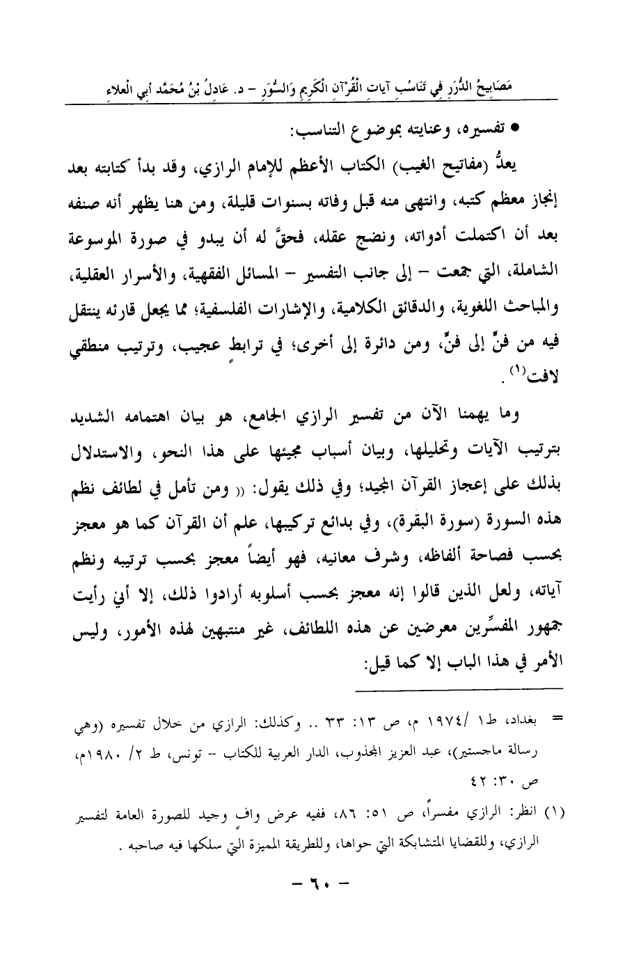 (1) انْظُر: الرَّازِيّ مُفَسرًا، ص 51: 86، فَفِيهِ عرض وافٍ وجيد للصورة الْعَامَّة لتفسير الرَّازِيّ، وللقضايا المتشابكة الَّتِي حواها، وللطريقة المميزة الَّتِي سلكها فِيهِ صَاحبه.