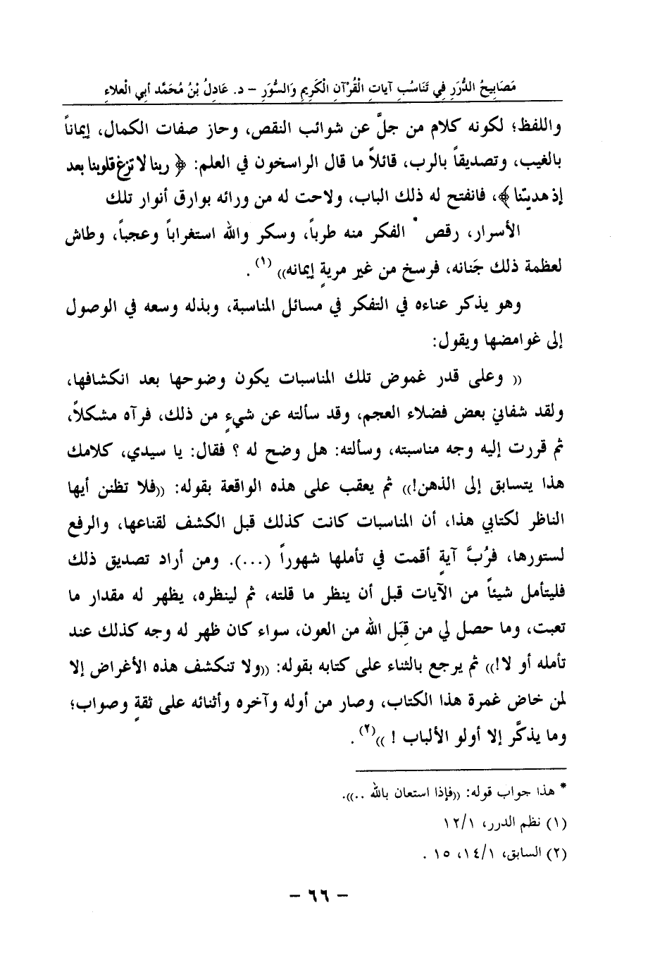 وَهُوَ يذكر عناءه فِي التفكر فِي مسَائِل الْمُنَاسبَة، وبذله وَسعه فِي الْوُصُول إِلَى غوامضها.. وَيَقُول: