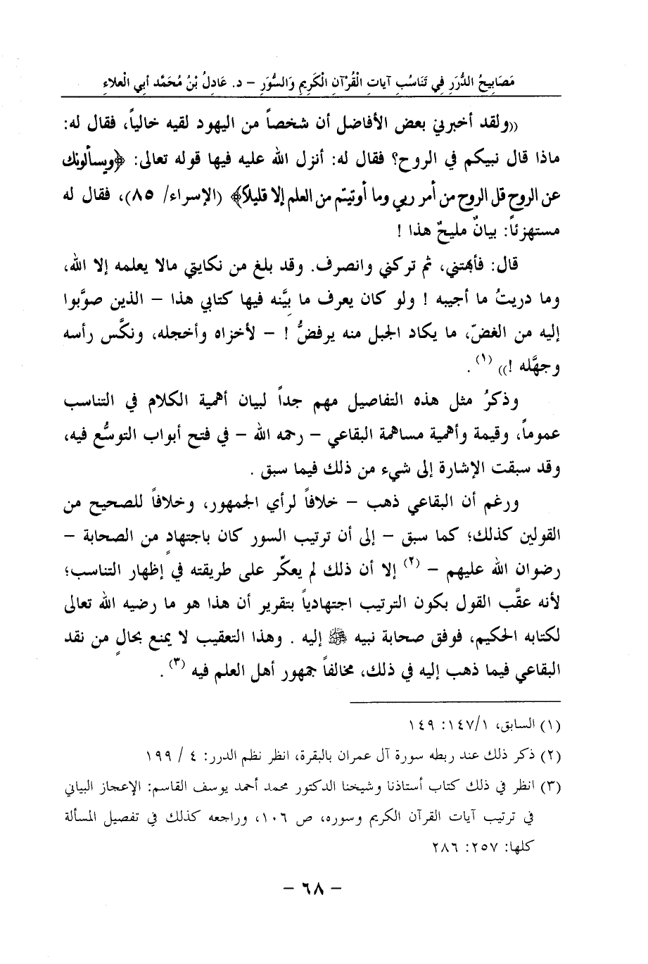 (3) انْظُر فِي ذَلِك كتاب أستاذنا وَشَيخنَا الدكتور مُحَمَّد أَحْمد يُوسُف الْقَاسِم: الإعجاز الْبَيَانِي فِي تَرْتِيب آيَات الْقُرْآن الْكَرِيم وسوره، ص 106، وراجعه كَذَلِك فِي تَفْصِيل الْمَسْأَلَة كلهَا: 257: 286