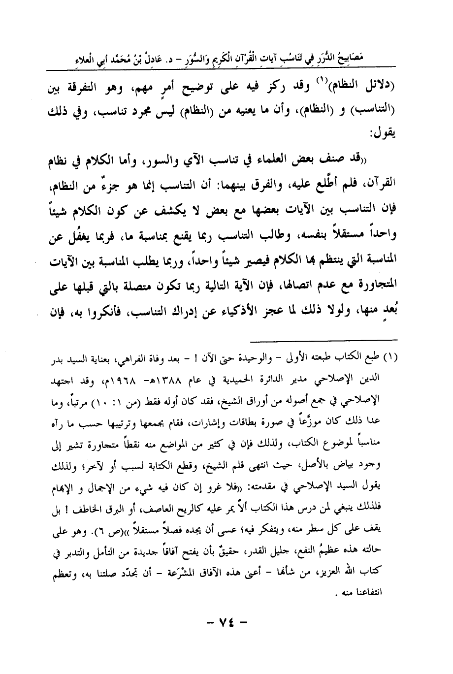 (1) طبع الْكتاب طبعته الأولى - والوحيدة حَتَّى الْآن {- بعد وَفَاة الفراهي، بعناية السَّيِّد بدر الدّين الإصلاحي مدير الدائرة الحميدية فِي عَام 1388? - 1968م، وَقد اجْتهد الإصلاحي فِي جمع أُصُوله من أوراق الشَّيْخ، فقد كَانَ أَوله فَقَط (من 1: 10) مُرَتبا، وَمَا عدا ذَلِك كَانَ موزَّعاً فِي صُورَة بطاقات وإشارات، فَقَامَ بجمعها وترتيبها حسب مَا رَآهُ مناسباً لموضوع الْكتاب، وَلذَلِك فَإِن فِي كثير من الْمَوَاضِع مِنْهُ نقطاً متجاورة تُشِير إِلَى وجود بَيَاض بِالْأَصْلِ، حَيْثُ انْتهى قلم الشَّيْخ، وَقطع الْكِتَابَة لسَبَب أَو لآخر.. وَلذَلِك يَقُول السَّيِّد الإصلاحي فِي مقدمته: ((.. فَلَا غرو إِن كَانَ فِيهِ شَيْء من الْإِجْمَال والإبهام.. فَلذَلِك يَنْبَغِي لمن درس هَذَا الْكتاب ألاَّ يمر عَلَيْهِ كَالرِّيحِ العاصف، أَو الْبَرْق الخاطف} .. بل يقف على كل سطر مِنْهُ، ويتفكر فِيهِ.. عَسى أَن يجده فصلا مُسْتقِلّا)) (ص 6) .. وَهُوَ على حَالَته هَذِه عظيمُ النَّفْع، جليل الْقدر، حقيقٌ بِأَن يفتح آفاقاً جَدِيدَة من التَّأَمُّل والتدبر فِي كتاب الله الْعَزِيز، من شَأْنهَا - أعنى هَذِه الْآفَاق المشْرَعة - أَن تجدّد صلتنا بِهِ، وتعظم انتفاعنا مِنْهُ..