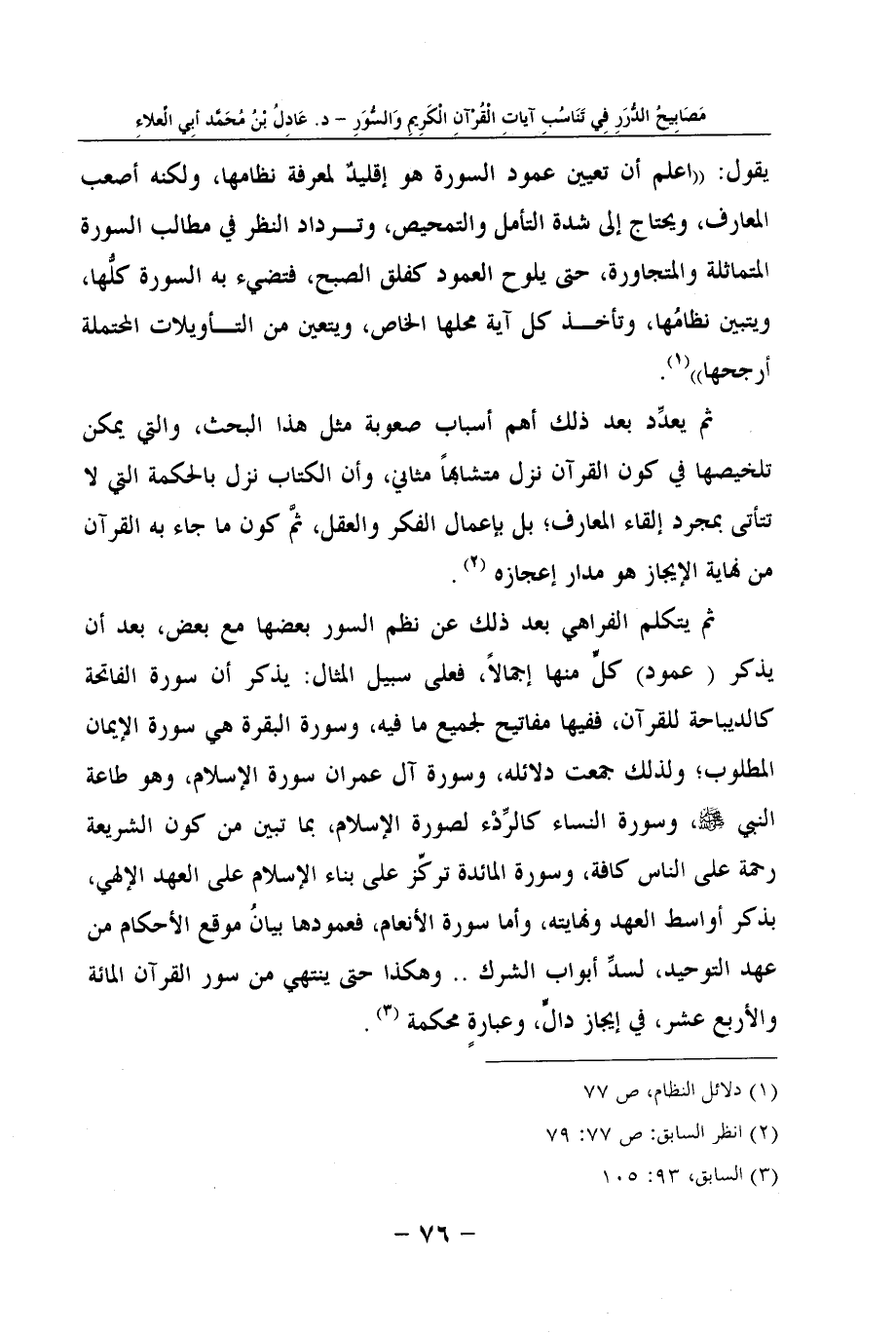 ثمَّ يتَكَلَّم الفراهي بعد ذَلِك عَن نظم السُّور بَعْضهَا مَعَ بعض، بعد أَن يذكر (عَمُود) كلٍّ مِنْهَا إِجْمَالا، فعلى سَبِيل الْمِثَال: يذكر أَن سُورَة الْفَاتِحَة كالديباحة لِلْقُرْآنِ، فَفِيهَا مَفَاتِيح لجَمِيع مَا فِيهِ، وَسورَة الْبَقَرَة هِيَ سُورَة الْإِيمَان الْمَطْلُوب؛ وَلذَلِك جمعت دلائله، وَسورَة آل عمرَان سُورَة الْإِسْلَام، وَهُوَ طَاعَة النَّبِي (، وَسورَة النِّسَاء كالرِّدْء لصورة الْإِسْلَام، بِمَا تبين من كَون الشَّرِيعَة رَحْمَة على النَّاس كَافَّة، وَسورَة الْمَائِدَة تركِّز على بِنَاء الْإِسْلَام على الْعَهْد الإلهي، بِذكر أواسط الْعَهْد ونهايته، وَأما سُورَة الْأَنْعَام، فعمودها بيانُ موقع الْأَحْكَام من عهد التَّوْحِيد، لسدِّ أَبْوَاب الشّرك.. وَهَكَذَا حَتَّى يَنْتَهِي من سور الْقُرْآن الْمِائَة والأربع عشر، فِي إيجاز دالٍّ، وعبارةٍ محكمَة (3) .
