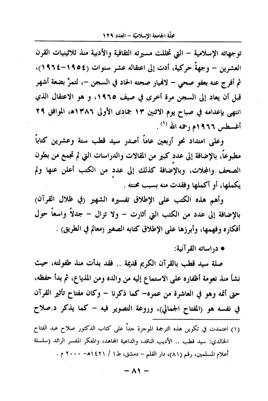 (1) اعتمدت فِي تكوين هَذِه التَّرْجَمَة الموجزة جدا على كتاب الدكتور صَلَاح عبد الفتاح الخالدي: سيد قطب.. الأديب النَّاقِد، والداعية الْمُجَاهِد، والمفكر الْمُفَسّر الرائد (سلسلة أَعْلَام الْمُسلمين، رقم (81) ، دَار الْقَلَم - دمشق، ط1 / 1421هـ - 2000 م.