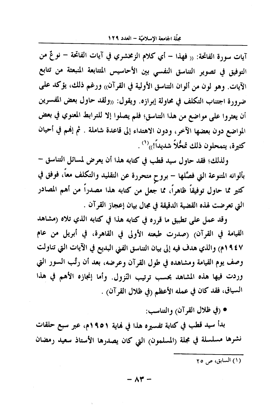 وَلذَلِك؛ فقد حاول سيد قطب فِي كِتَابه هَذَا أَن يعرض لمسائل التناسق - بألوانه المتنوعة الَّتِي فصَّلها - بروحٍ متحررة عَن التَّقْلِيد والتكلف مَعًا، فوفق فِي كثير مِمَّا حاول تَوْفِيقًا ظَاهرا، مِمَّا جعل من كِتَابه هَذَا مصدرا من أهم المصادر الَّتِي تعرضت لهَذِهِ الْقَضِيَّة الدقيقة فِي مجَال بَيَان إعجاز الْقُرْآن.