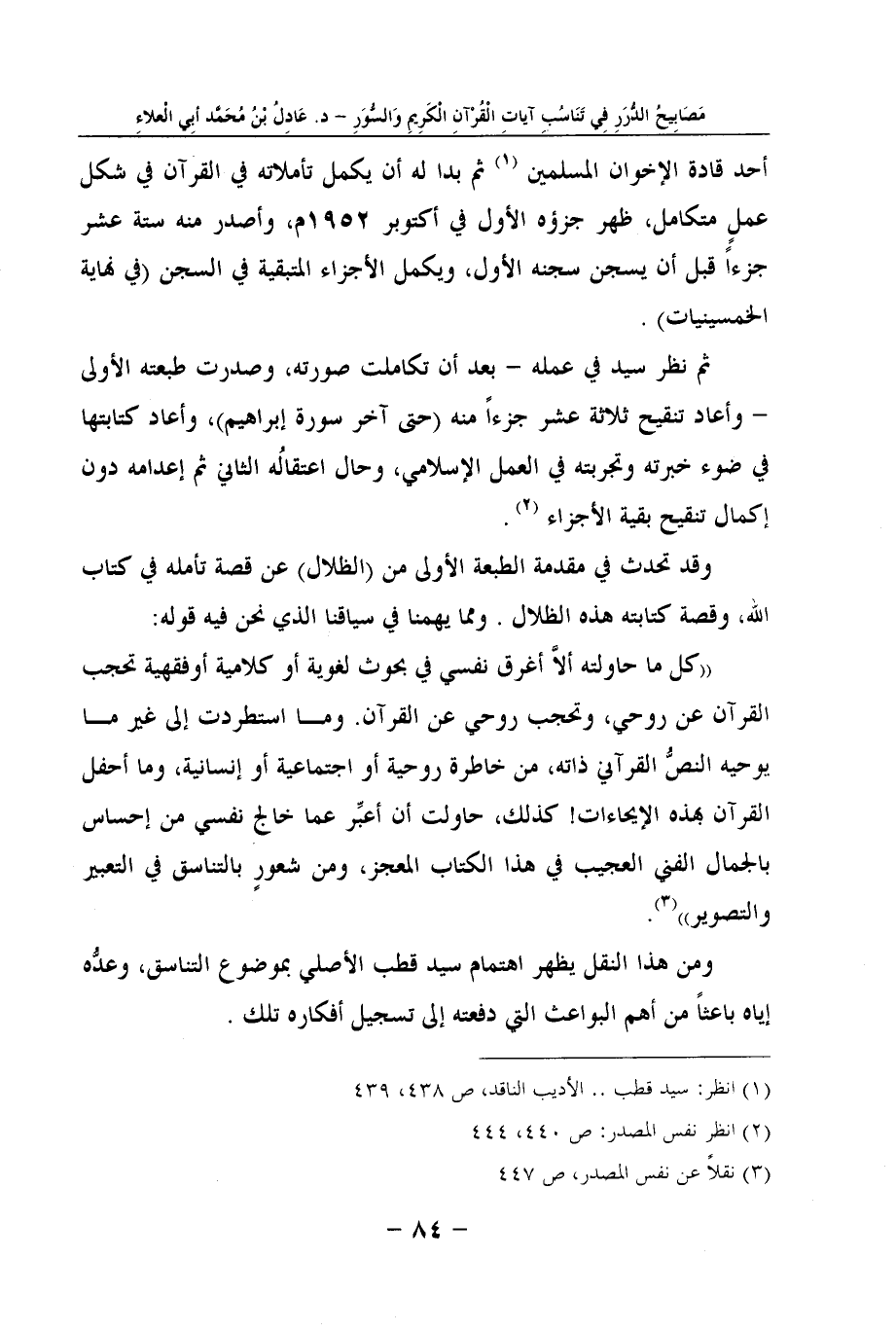 وَمن هَذَا النَّقْل يظْهر اهتمام سيد قطب الْأَصْلِيّ بموضوع التناسق، وعدُّه إِيَّاه باعثاً من أهم البواعث الَّتِي دَفعته إِلَى تسجيل أفكاره تِلْكَ..